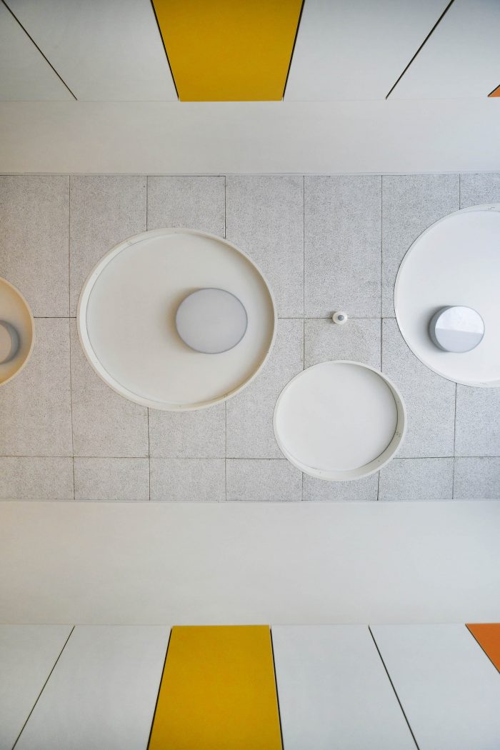 内部概念提供了界限清晰的房间,这些房间可以灵活地相互连接,用于日托中心和协同工作区。材料仅限于裸露的混凝土、橡木、白色的HWL天花板,以及一些颜色的点缀。内置的家具设置了额外的点缀,并且在每一层都有不同的设计。三角形、圆形和正方形,作为楼层的特征图案,给孩子们带来了良好的定位和识别。