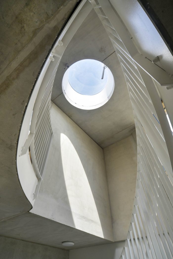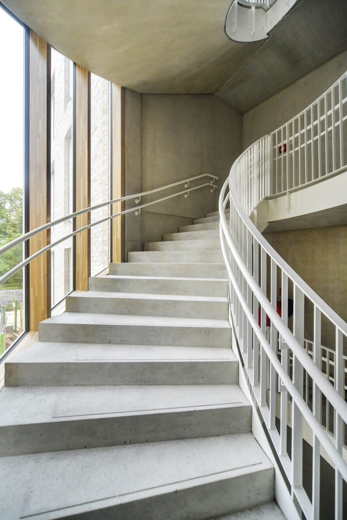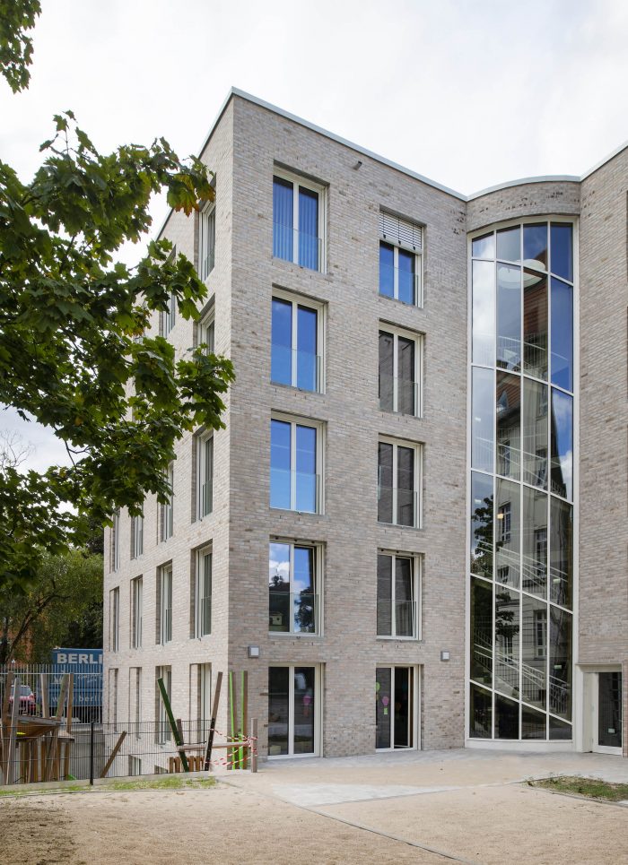 A stairwell on an elliptical floor plan, which was developed from the historical floor plan, connects the daycare internally and creates additional play areas for the children. Kolb Ripke Gesellschaft von Architekten, together with EiSat GmbH Gesellschaft Consulting Engineers for Construction, Marko Augustat + Partner GmbH and Dr. Gabriele Holst Landschaftsarchitektur planned this new building of the day-care center as well as office space for the Berlin University of Technology on behalf of the studierendenWERK BERLIN. The new building project is an important measure for the creation of a family-friendly university and as such makes a decisive contribution to the compatibility of studies, work, and family.