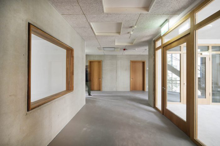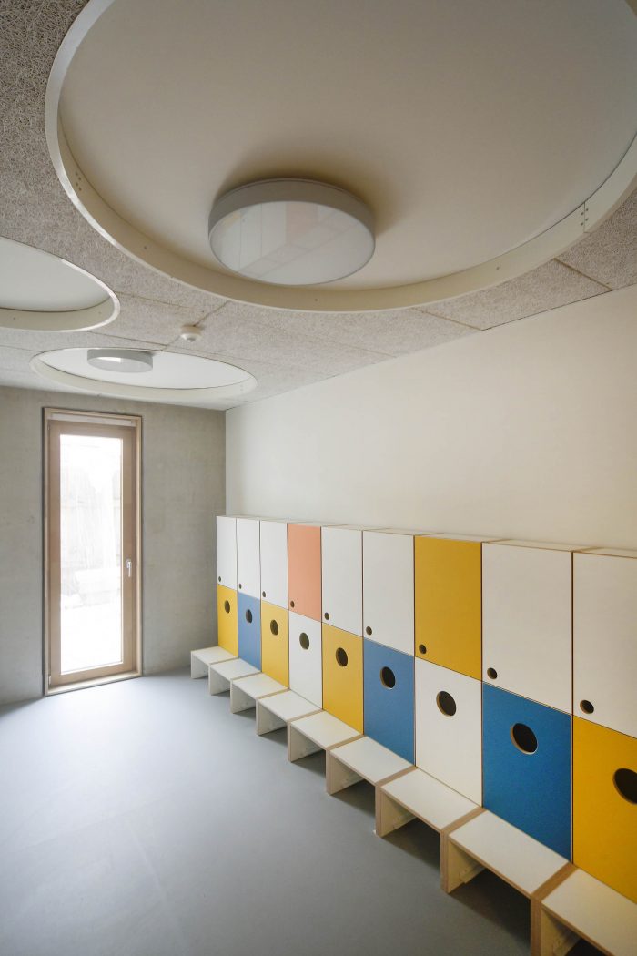 The interior concept provides for clearly delimited rooms that are flexibly connected to each other, both for the daycare center and the coworking areas. The materials are limited to exposed concrete, oak, white HWL ceiling tiles, and a few color accents. The built-in furniture sets additional accents and is designed differently on each floor. Triangles, circles, and squares, which are characteristic of a floor as a motif, give the children good orientation and identification.