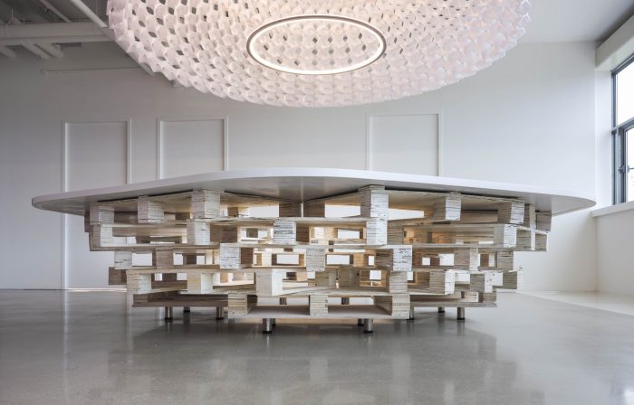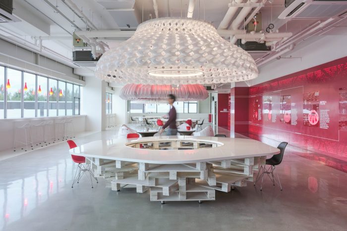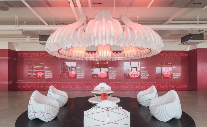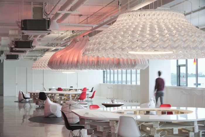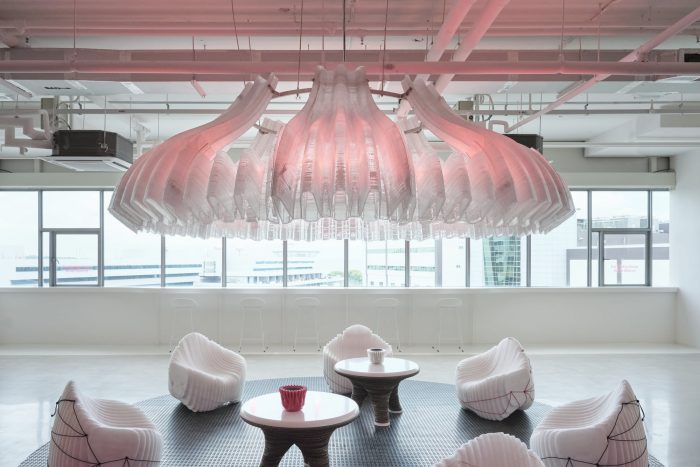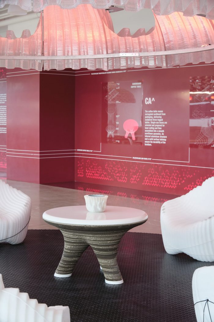 This new communal space leverages new technologies in Additive Manufacturing and Digital Design, with materials derived from waste upcycled into design pieces that are functional and elegant. Using more than 30,000 plastic bottles, discarded cardboard boxes, foam packages, and wood pallets are given a second life through 3D printing and computer numerical control cutting, producing beautiful furniture and spaces.