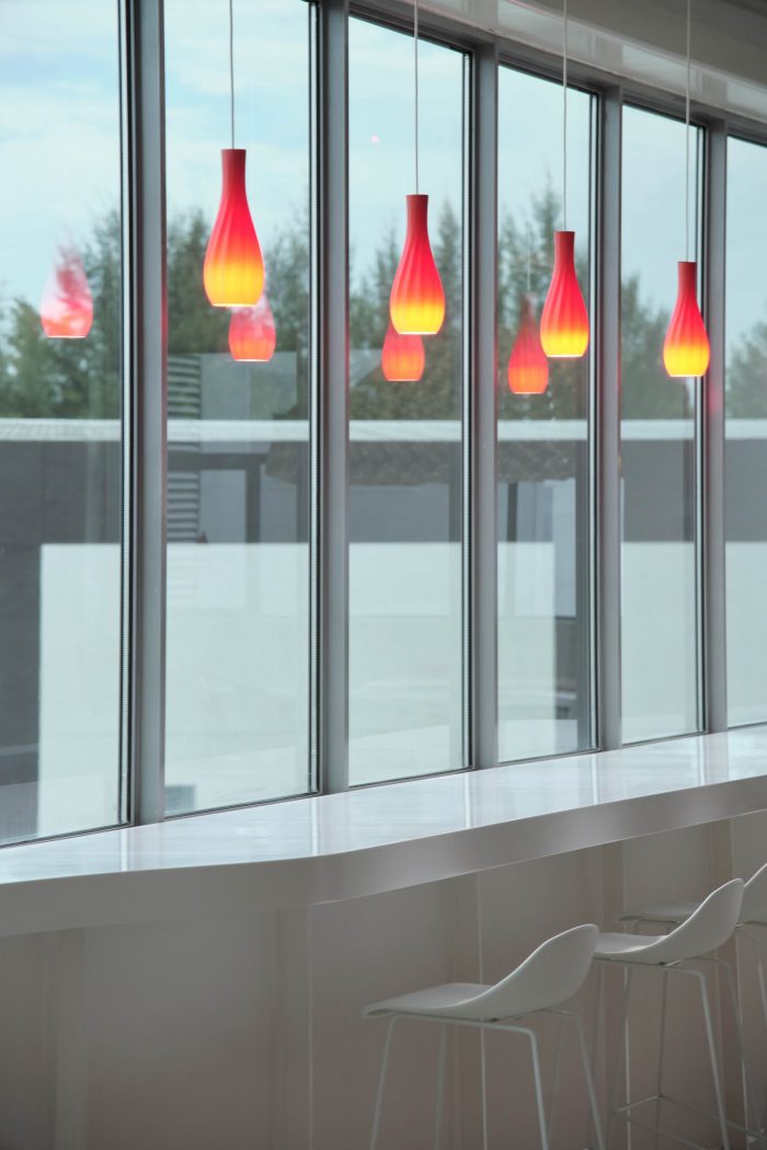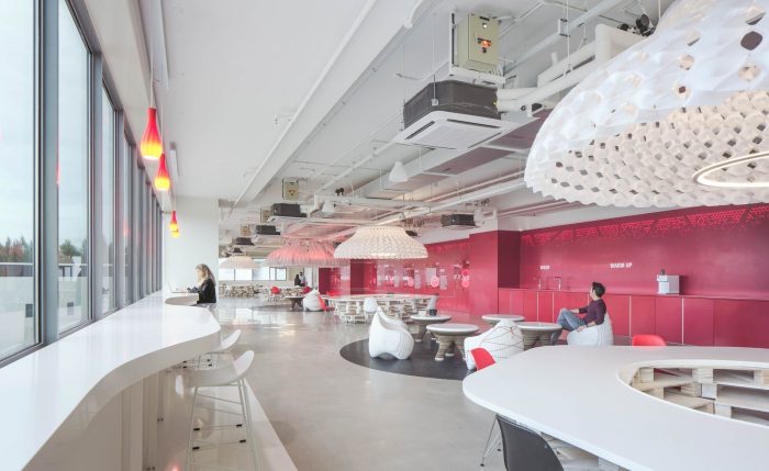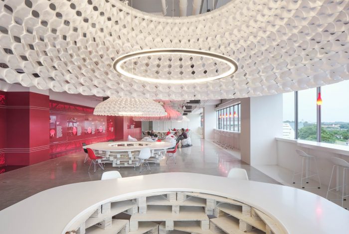 空间的务实布局分为三条带子:红色的墙面,所有的设计都用技术轴测图来解释,解决了制造过程中的深度和复杂性;窗边的白色带子通过创造一个长桌,将开放的视野和自然光最大化,精致的吊灯由生物聚合物3D打印而成;中央区域,社会活动在回收的PETG吊灯下发展;周围则是包容的托盘桌、纸板咖啡桌和泡沫椅。这是新加坡第一个采用尖端技术和数字设计流程的室内设计,将废物重新用于功能性和优雅的室内空间,为用废物构思装饰品、家具和空间的全新方式铺平道路。