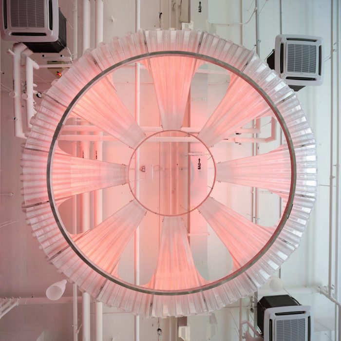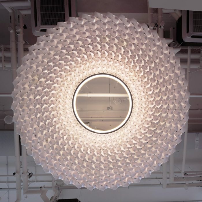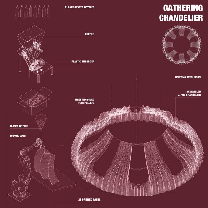 The Gathering Chandelier is a 4m diameter dome-like lighting fixture made of 16 large, robotically printed pieces. Its design was parametrically produced to be manufacturable with single, continuous extrusion. Each component’s bounding box size is around 1.50x0.60, 0.40m. The chandelier was suspended from the ceiling using a top ring. On the bottom part, a compression ring contains the lighting elements. The fabrication process was developed and calibrated by the research team. It consists of a large ABB robotic arm and an extruder fed with 200 kg of recycled PET pellets.