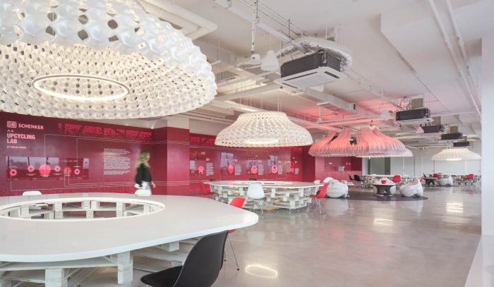 The project started in 2018 with the ambition to create awareness of the circularity in the logistics and supply industry among users and visitors by developing a space from waste material. Initially starting with a brief for the DB Schenker employee lunchroom, AirLab's goal evolved from the initial brief's scope to become the "large room." The Upcycling Hub was designed to showcase the value of waste material. This creates a space to reassess our understanding of waste throughout all supply chain stages from design, production, and consumption through new 3D printing processes.