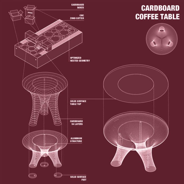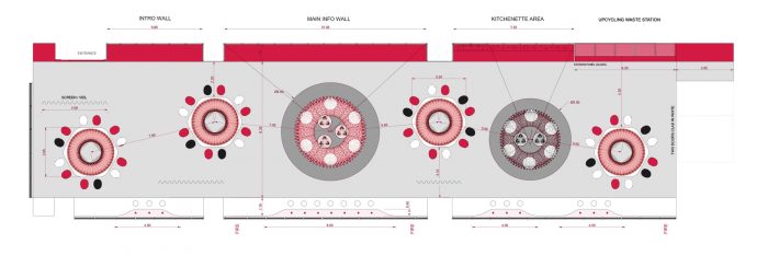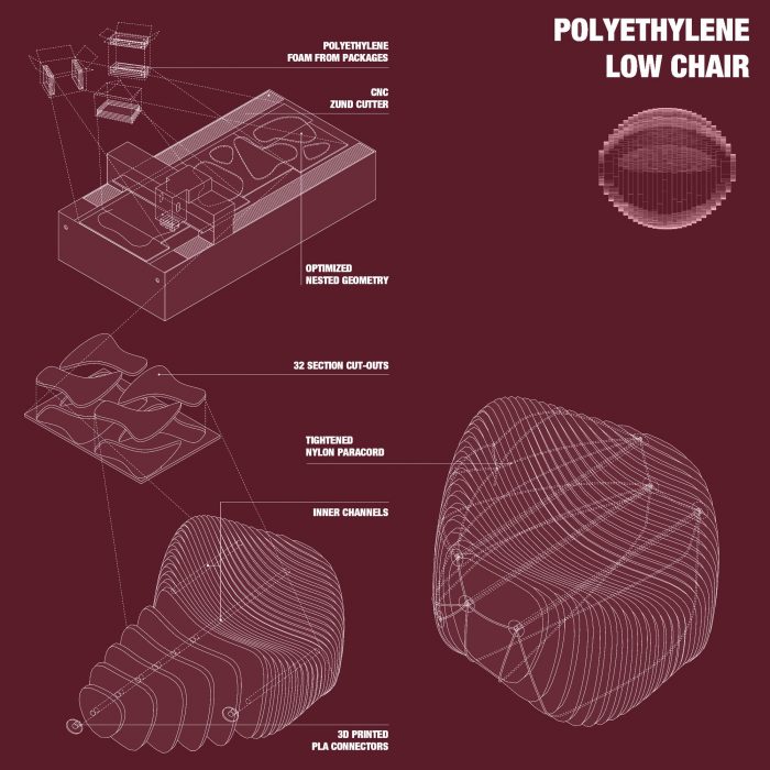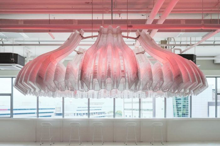The pragmatic layout of the space is organized in three bands: the red wall, where all designs are explained using technical axonometric drawings, addressing the depth and complexity of the processes used during fabrication; the white band at the window side maximizes open views and natural light by the creation of a long table, where delicate pendant lights are 3D printed from biopolymers; the central area, where social activity is developed under the recycled PETG chandeliers; and around inclusive pallet tables, cardboard coffee tables, and foam chairs. It is the first Interior Design in Singapore to implement cutting-edge technologies and digital design processes to repurpose waste into functional and elegant interior spaces paving the path for an entirely new way of conceiving ornament, furniture, and spaces from waste.