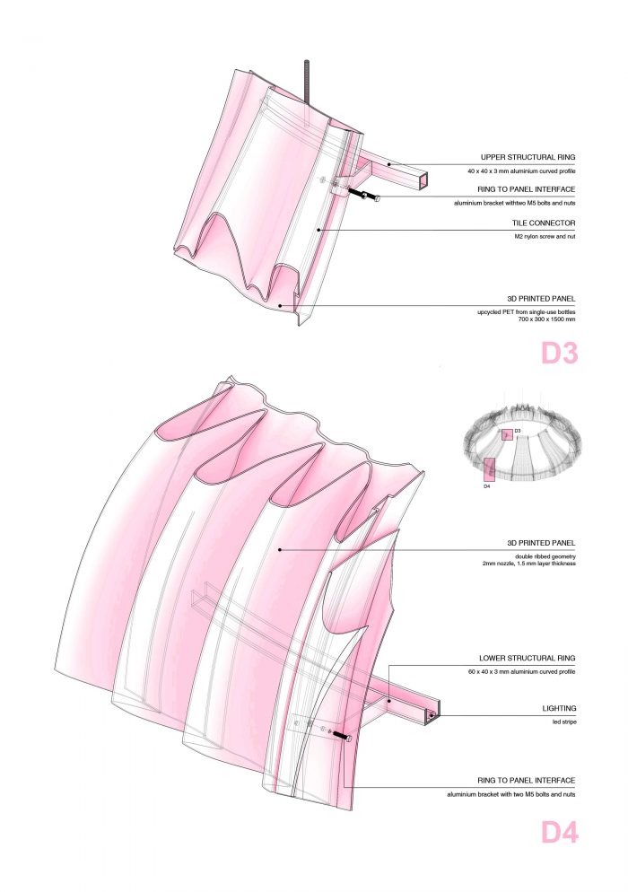 此外,四个餐饮吊灯测试了使用传统的FDM 3D打印机和回收的PET长丝创建一个大型的建筑装置。为这个项目创建了四个相同的3.5米直径的吊灯。穹顶由10排每排45个部件组成,每个穹顶有450个部件。这450个部件中的每一个都被设计成可以用标准的FDM打印机打印,建造体积小于200x200x100mm。每块瓷砖的几何形状是基于最小的Schwarz D("钻石")表面,它被设计为可打印的,没有支撑物,在其制造过程中产生零浪费。穹顶中最上层的元素被明确地设计为与一个铝环相连接,将穹顶悬挂在天花板上。照明是用一个悬挂在中心的LED环来解决的,并向吊灯投射光线。对组件之间的连接给予了仔细的关注,用隐藏尼龙螺母和螺栓的功能来解决这个问题。四个穹顶中的每一个所回收的塑料总量为60公斤。