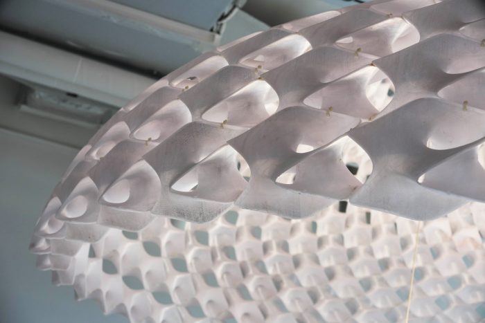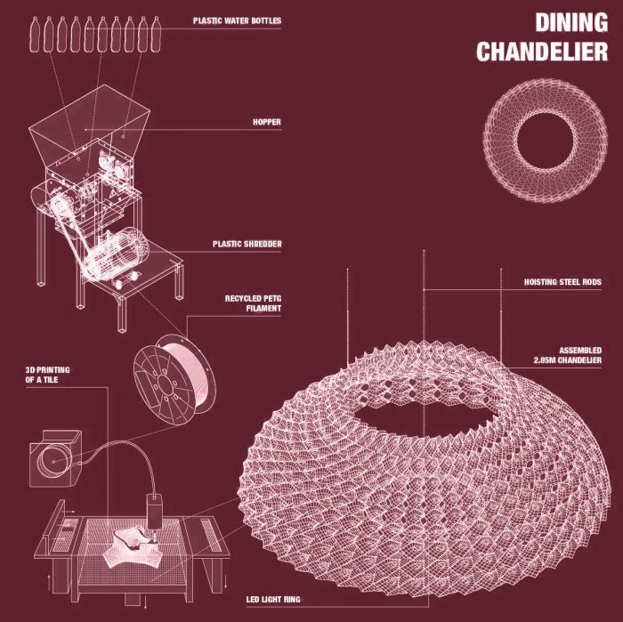 In addition, the four Dining Chandeliers test the creation of a large-scale architectural fixture using conventional FDM 3D printers and recycled PET filament. Four identical 3.5m diameter chandeliers were created for this project. The domes consist of 10 rows of 45 pieces each, accounting for 450 pieces per dome. Each of the 450 components was designed to be printable with a standard FDM printer, with built volumes smaller than 200x200x100mm. The geometry of each tile was based on a minimal Schwarz D ("Diamond") surface, and it was designed to be printable without supports, producing zero waste in its fabrication. The uppermost element in the dome was explicitly designed to interface with an aluminum ring that suspends the dome from the ceiling. The lighting was solved with an LED ring suspended in the center and projecting light toward the chandelier. Careful attention was given to the connection between components, which was solved with features that concealed nylon nuts and bolts. The total plastic recovered for each of the four domes is 60kg.