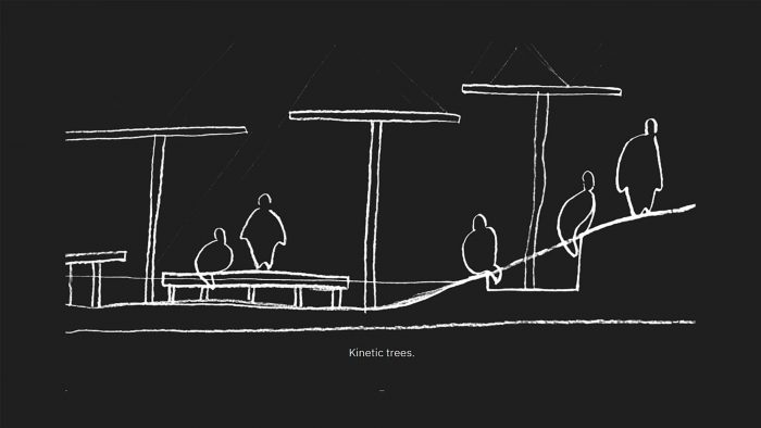 The design layers new elements in view of the old. The historical villa facade stands untouched, in contrast to a new 2-story structure of steel and glass, with both structures connected by an expressive loop staircase. Bespoke rotating kinetic sculptures dot the outdoors, acting as a shading solution and a landmark — and a visual metaphor for growth.