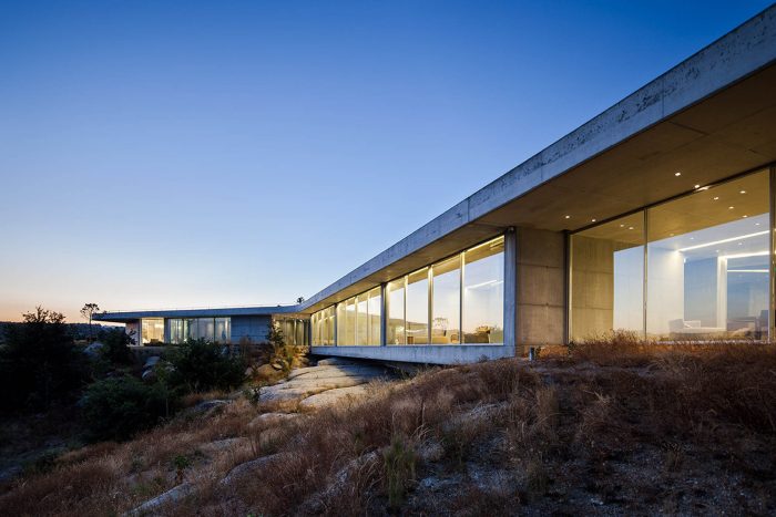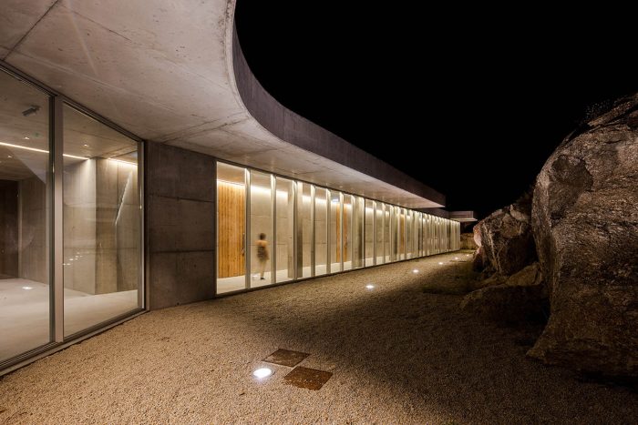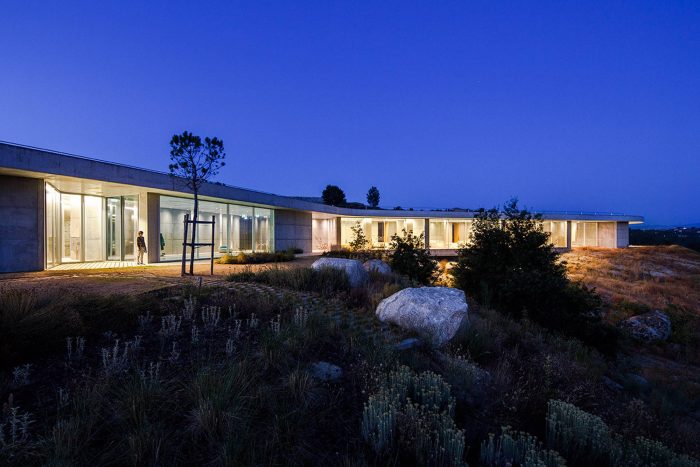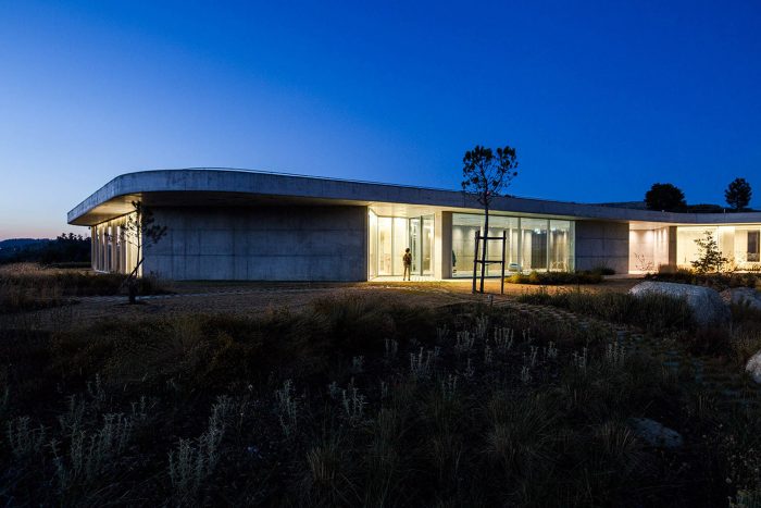 It defines an extensive course that represents the dimension of the territory on which is placed and is built in a level quota, being the direct result of the topography. The building is drawn by the land, and its openings, orientations and intern definition of the program respect the main points of view over the vineyard, natural light’s control and the discretion that is intended for the group, in spite of its apparent dimension.