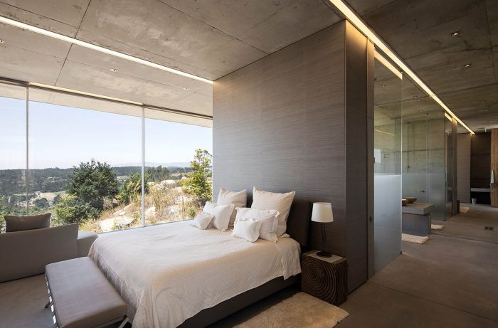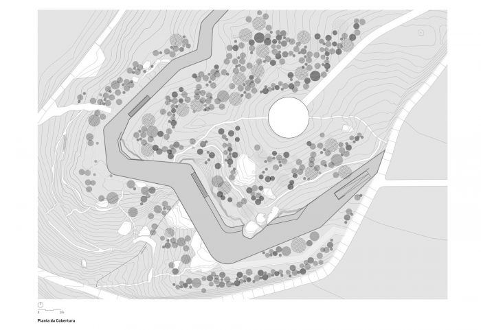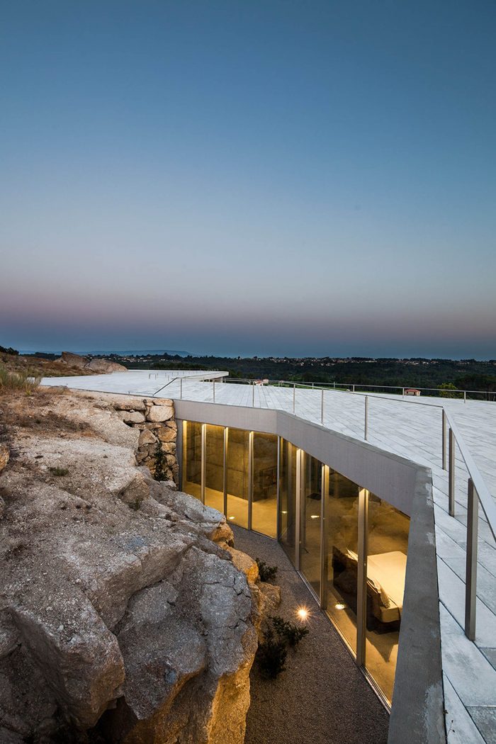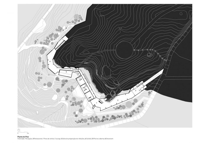 The Guesthouse doesn't have a formal reception; the services create an intimate atmosphere, family like and exclusive. The bedroom is not just the private domain; it includes other spaces of social character, which makes this equipment different from the usual offer of temporary lodging. The bedroom is really a small house. The association established with the wine production justifies the restaurant. It includes spaces for wine proofs, and a reserved area to discussion, analysis and wine critic, suggesting a flexible drawing for the space in all these uses. The building’s drawing is developed starting from the topography, based in contour lines, as a reference to the platforms and the distant association that unites them in time, characteristic of wine’s production especially in the Douro and Dão region.