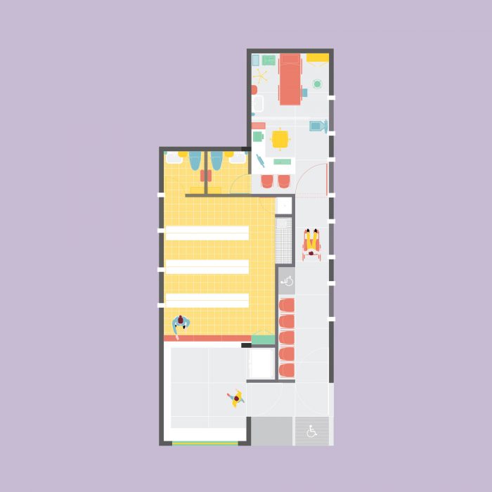 Considering the dynamics of the waiting room area, the placement of colors was crucial to transmit comfort sensations and allow the user to enjoy the space. Starting with a yellow color representing energy, strength, and happiness, blue symbolizing serenity and calm, last, pink expressing kindness and delicacy.
