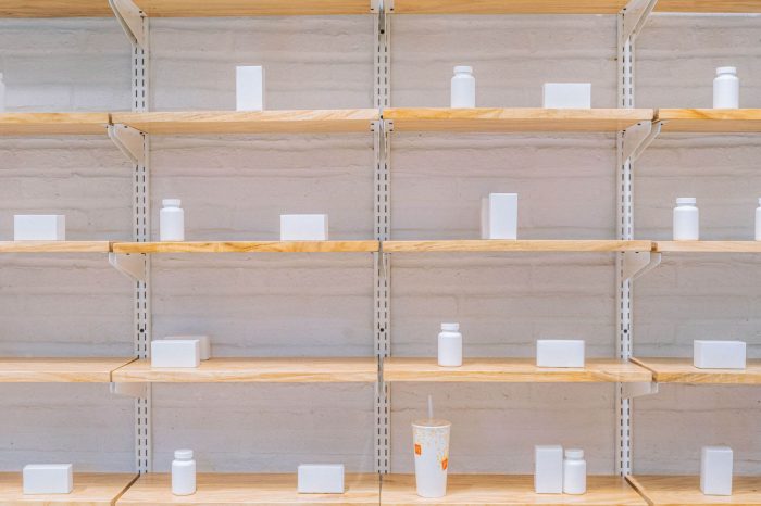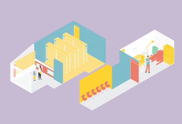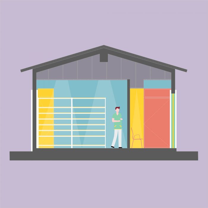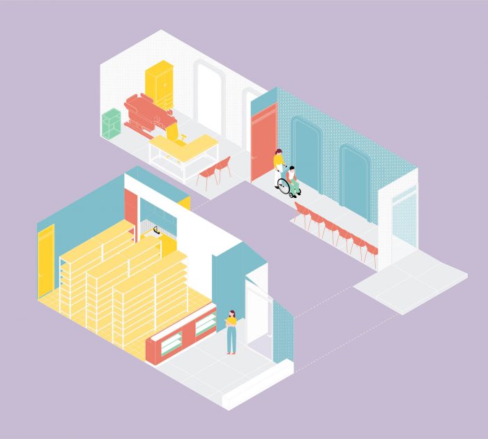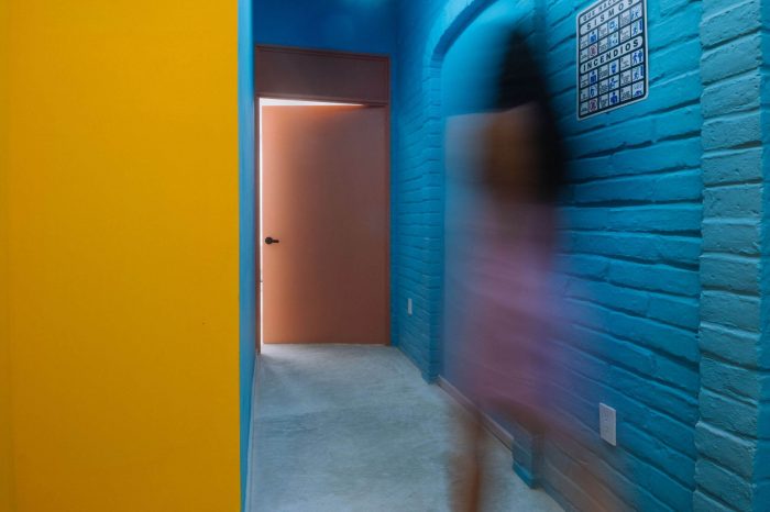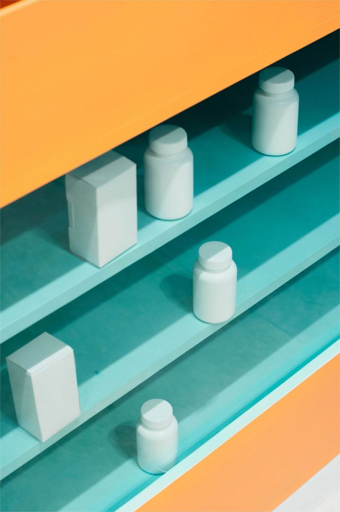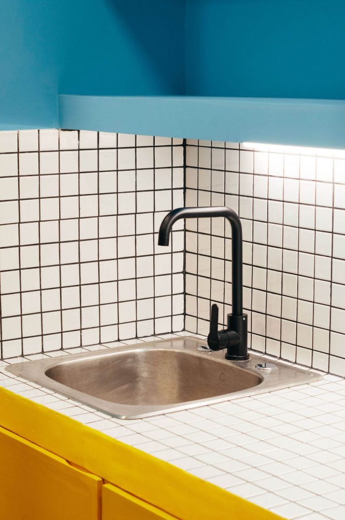 On the other hand, the kitchenette seeks to stand out with the implementation of primary colors, neutral lighting and reticular pattern composition. By disrupting the continuity of the space generated by corridors, it distinguishes its use from the rest of the pharmacy and creates a visually fun and attractive image. Along with the establishment, neutral lighting was also essential to highlight colors and patterns without visually modifying them.