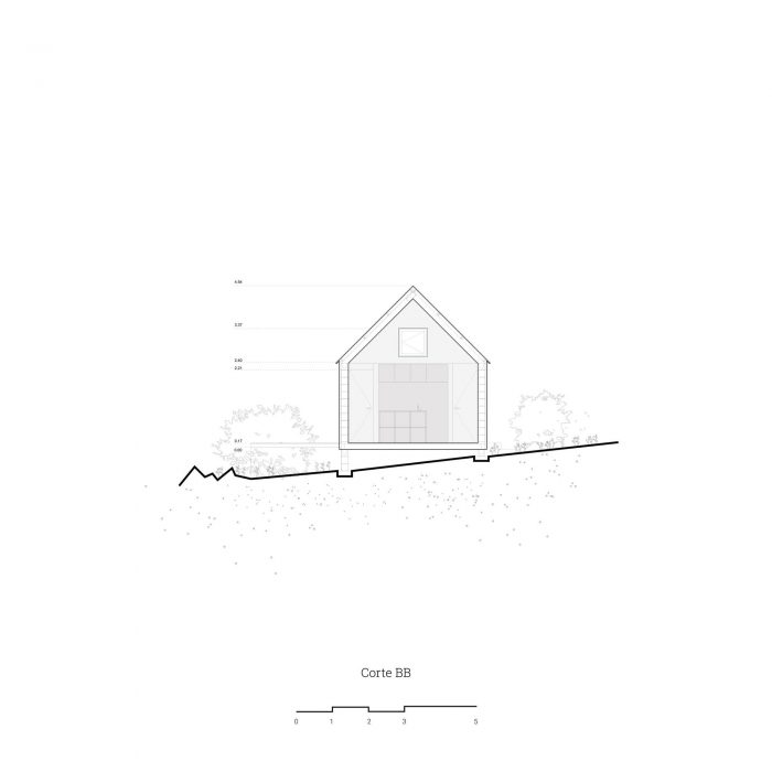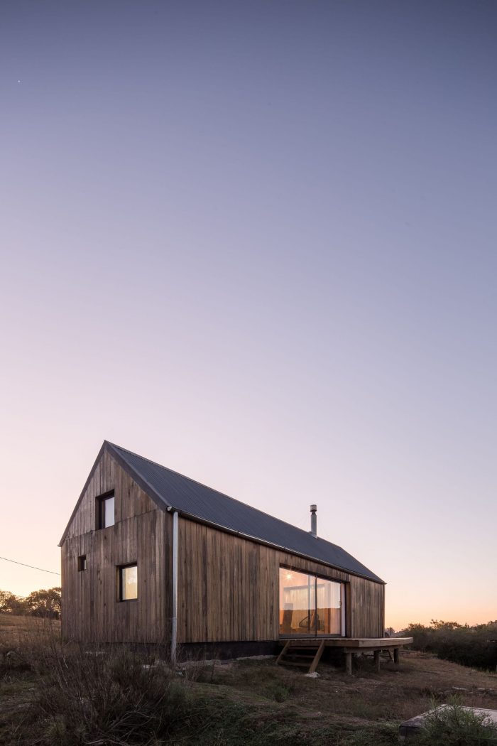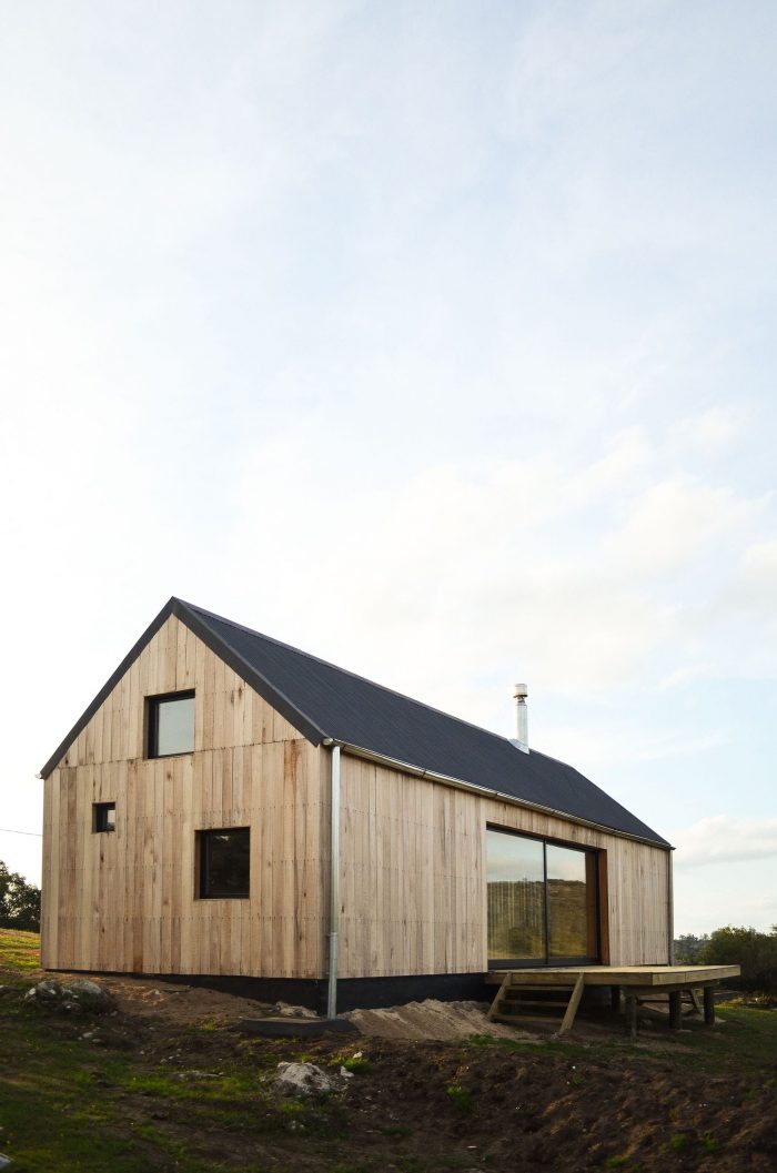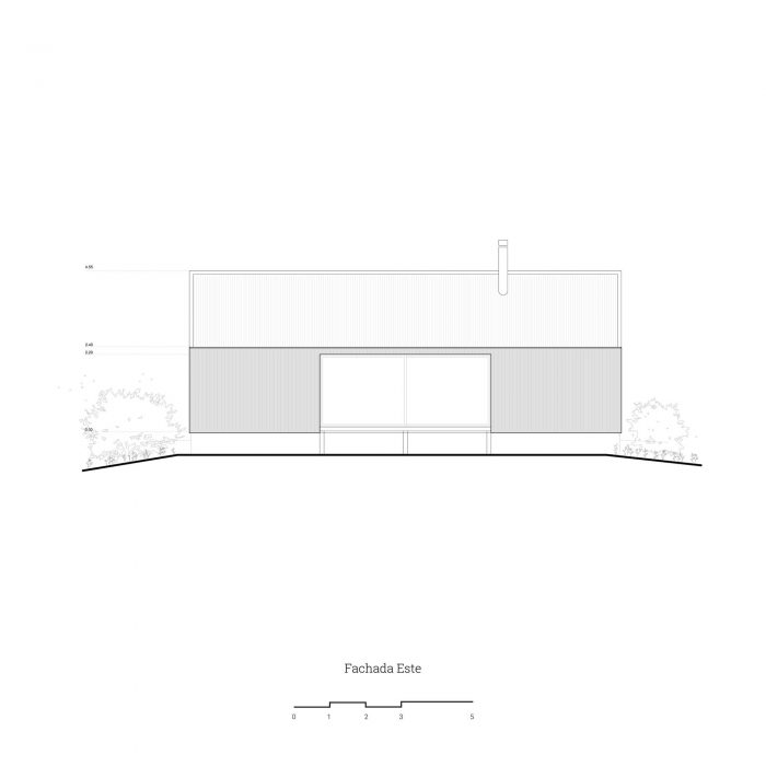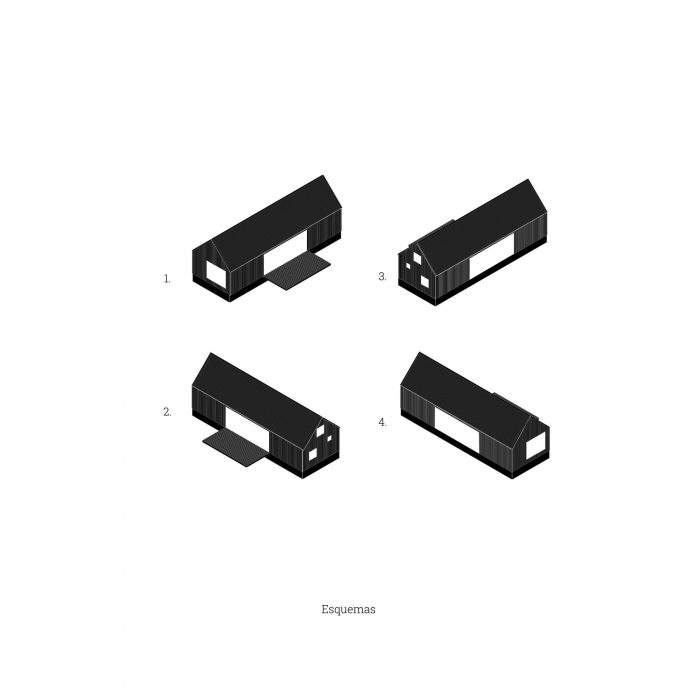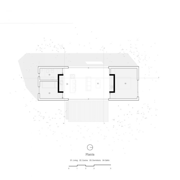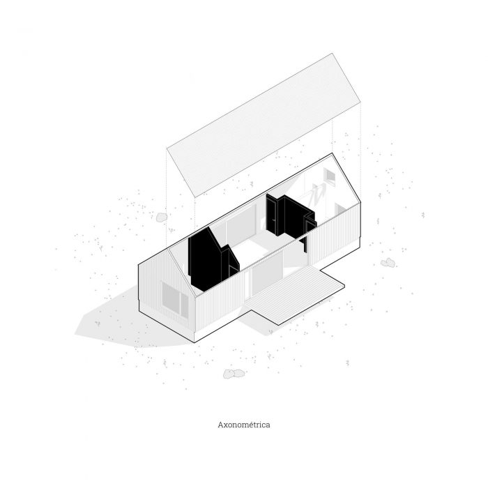 In this sense, it was decided to use a language inspired by the typology of the "barn" or cabin-refuge, with a rectangular layout and sloping roofs that favor amplitude in the interior spatiality while occupying an ideal function for the runoff and collection of rainwater. To incorporate the housing program, it was decided to opt for a simple floor plan based on symmetrical organization barely distorted by the interior distributions of the ends. The central space, pass through and is fully connected in its longitudinal faces with the outside by two large sliding windows, corresponds to the social space that is contained in the transversal sense by two programmatic "parentheses" that house different facilities of the kitchen and living room. Behind these, at the ends of the assemblage, are located the rooms and the bathroom.