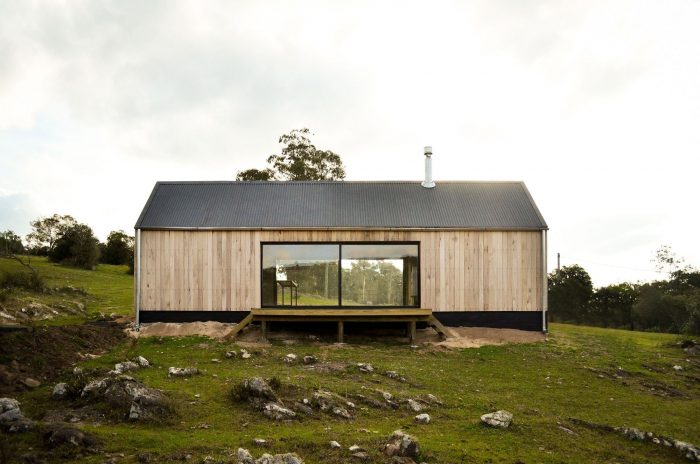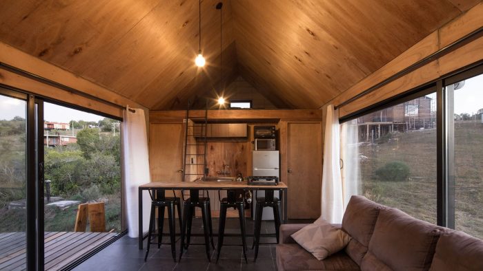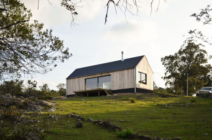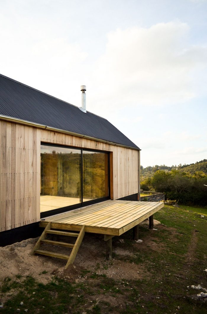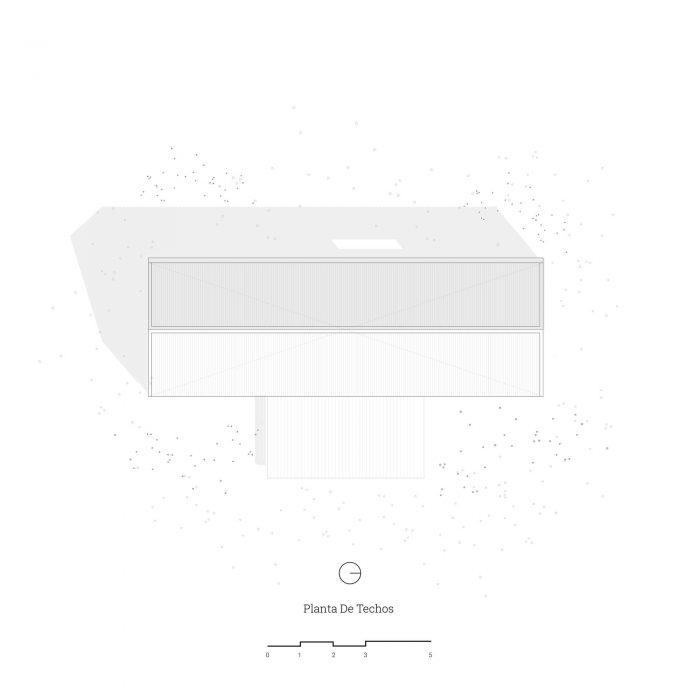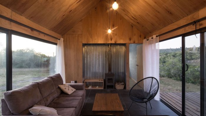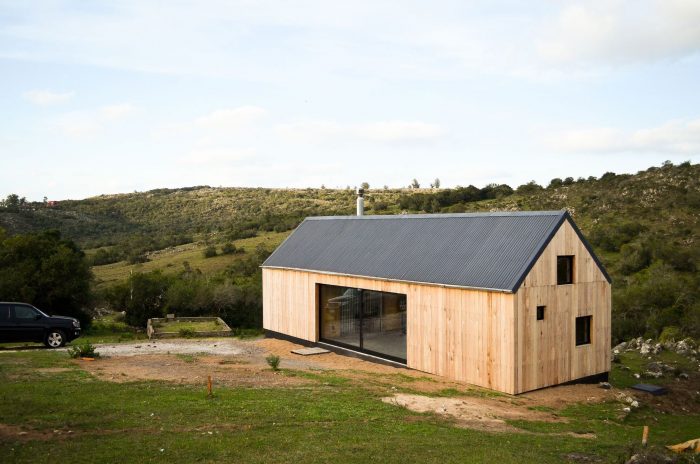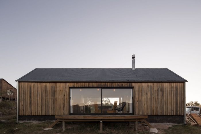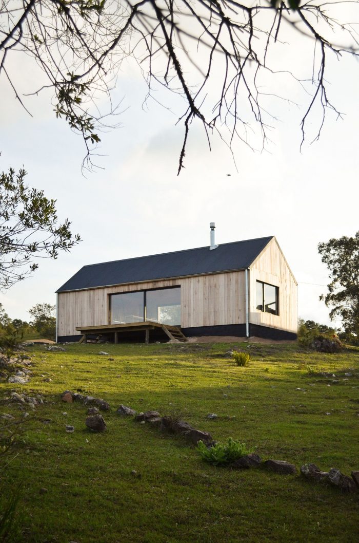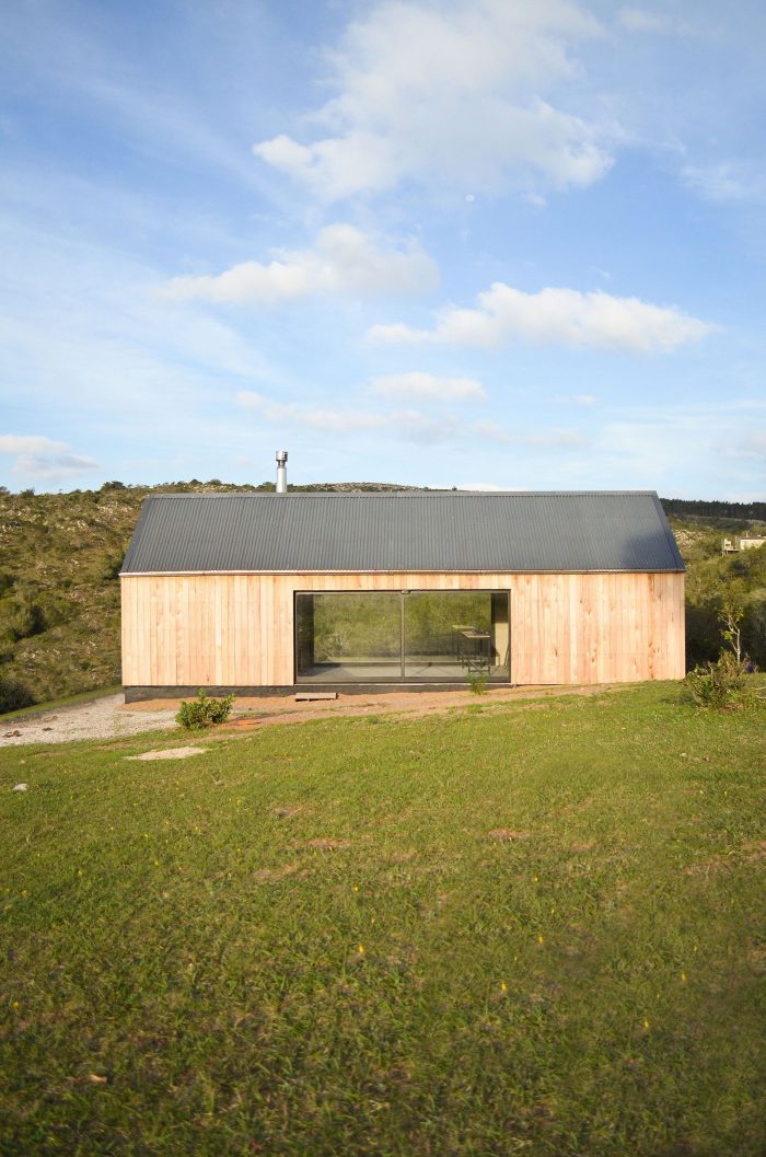 In this sense, it was decided to use a language inspired by the typology of the "barn" or cabin-refuge, with a rectangular layout and sloping roofs that favor amplitude in the interior spatiality while occupying an ideal function for the runoff and collection of rainwater. To incorporate the housing program, it was decided to opt for a simple floor plan based on symmetrical organization barely distorted by the interior distributions of the ends. The central space, pass through and is fully connected in its longitudinal faces with the outside by two large sliding windows, corresponds to the social space that is contained in the transversal sense by two programmatic "parentheses" that house different facilities of the kitchen and living room. Behind these, at the ends of the assemblage, are located the rooms and the bathroom.