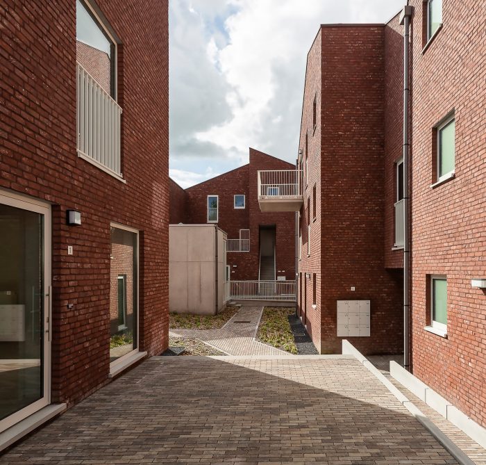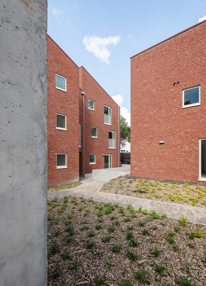 Three intertwined volumes of flats and individual homes for rent were created a stone's throw away from the city center of Waasmunster, Belgium. The buildings are all centered around a collective green courtyard. Paths, footbridges, and external staircases connect the housing units, animate the new outdoor space, and promote social cohesion through interaction.