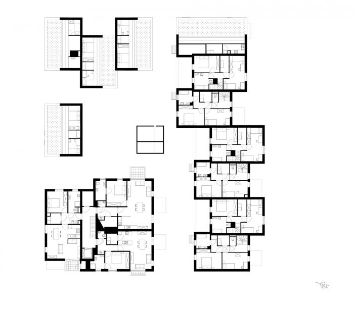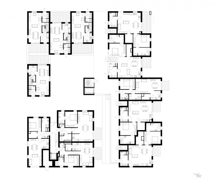 该项目由25个社会住房单元组成,分布在三个住宅区。这些体量结合了四个有地面通道的房屋和21个非常多样化的公寓和复式楼。其中有七套公寓是为行动不便的人准备的。该项目还得到了地下室储藏室和宽敞的自行车棚的补充。两者都可以通过坡道和外部电梯进入。斜坡以一种美观的方式将空气和自然光拉入地下空间。