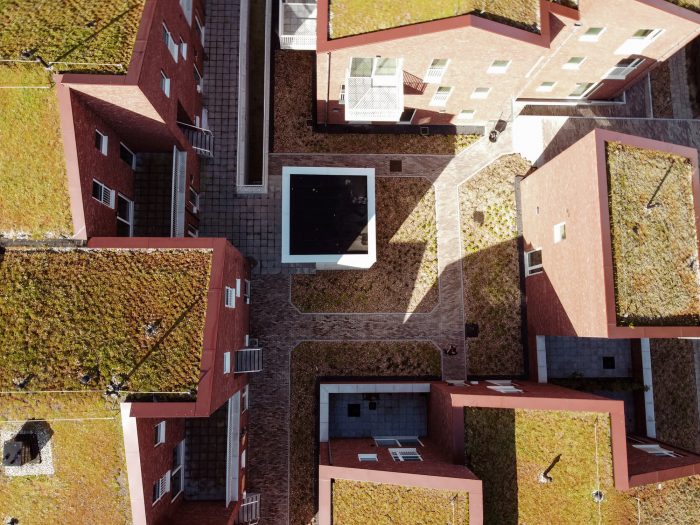 这些建筑很密集,但不影响私人室内和室外空间之间的质量。通过节约使用场地面积,选择既持久又低维护的建筑材料,以及使用绿色屋顶来延迟雨水排入下水道系统,体现了可持续发展的方法。此外,正在努力改善该地区的动植物群,该场地还配备了一个大型自行车棚,以鼓励居民使用自行车。