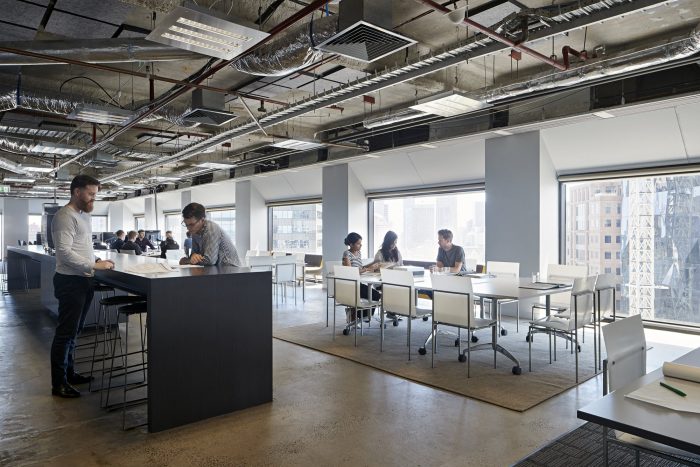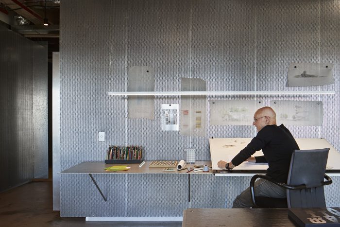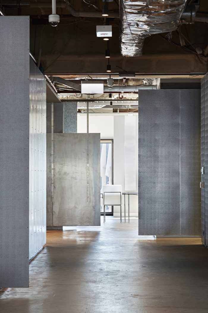 The project is a result of an internal, continuously evolving brief. Firstly, we wanted to create a memorable entry instantly signaling the practice as a creative institution within a corporate tower. A small lift lobby was removed, welcoming visitors and staff directly into reception/gallery, framed by perforated galvanized sheet walls, subtly revealing enlarged design sketches. The centerpiece reception seat seemingly morphs out from the floor – is it furniture or sculpture? A six-meter singular span of aluminum forms a reception desk and informal meeting space. Large meeting rooms are immediately accessible, each maximizing the use of simple, large aluminum tables and focused on large, wireless-enabled displays. Our brief for working spaces was simple. Maximize daylight, openness, amenity, utility, and open-plan workplace connectivity, while minimizing clutter and distraction.