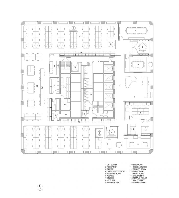 该项目是一个内部的、不断演变的简报的结果。首先,我们希望创造一个令人难忘的入口,立即表明该事务所是企业大厦中的一个创意机构。一个小的电梯大厅被拆除,直接欢迎访客和员工进入接待/画廊,由穿孔的镀锌板墙框住,巧妙地揭示了放大的设计草图。中间的接待座位似乎从地板上变形出来--它是家具还是雕塑?一个六米长的铝制单跨构成了一个接待台和非正式的会议空间。大型会议室可以立即进入,每个会议室都最大限度地使用了简单的大型铝制桌子,并专注于大型的无线显示屏。我们对工作空间的简介很简单。最大限度地提高日光、开放性、便利性、实用性和开放式工作场所的连接性,同时最大限度地减少杂乱和干扰。