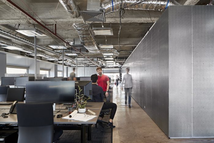 Ceilings and floors are stripped out revealing the honesty of services and structure. Perforated galvanized steel sheet and burnished aluminum is the dominant material, reflecting daylight and enabling any surface to be used for pinup. Functional utility spaces (kitchen, server room, model shop, printers, storage, and staff lockers) wrap the central core, accessible yet concealed. Finally, we wanted to create a great amenity for our staff. Sit-stand desks allow flexibility and encourage healthy posture. A central hub breakout space with coffee machine unites staff. Flexibility allows re-configuration for lunchtime table tennis, functions and events. A central audio-visual display with wireless connectivity enables presentations.