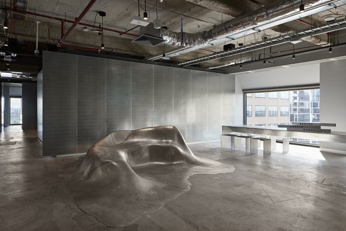Our overall approach is raw, stripped back, ultra-minimalist, rejecting current fashionable trends of warm, timber-lined, faux-luxury. We have worked hard to make this into something that reflects our design ethic and culture without excess embellishment, through Absolute rigor of stripping away and minimizing clutter and distraction. Hard-working, function-first approach to maximizing utility and amenity. The reception seat is the stand-out insertion, a distinctive and memorable element. It is not an object of place on the floor; it is the floor itself – swollen and split.