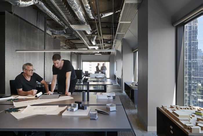 After 35 years, we outgrew our studio at 49 Exhibition Street, Melbourne. Spread over five small floors, we needed a new contemporary workspace with high connectivity, high flexibility, and good daylight and amenity. Level 19 in the IM Pei classic modernist tower at Collins Place, allowed us to consolidate onto a single floor. We asked ourselves the question – how do you make a design studio out of a corporate office shell? The building offered a traditional, central core floor plate of 976m2, with great daylight from large framed windows, giving a decidedly non-corporate feel.