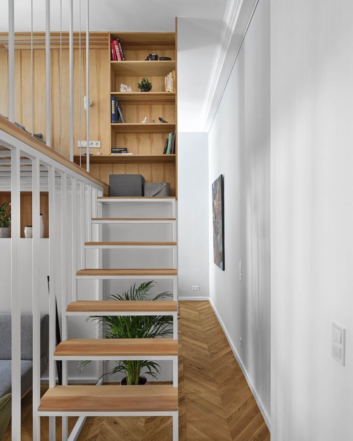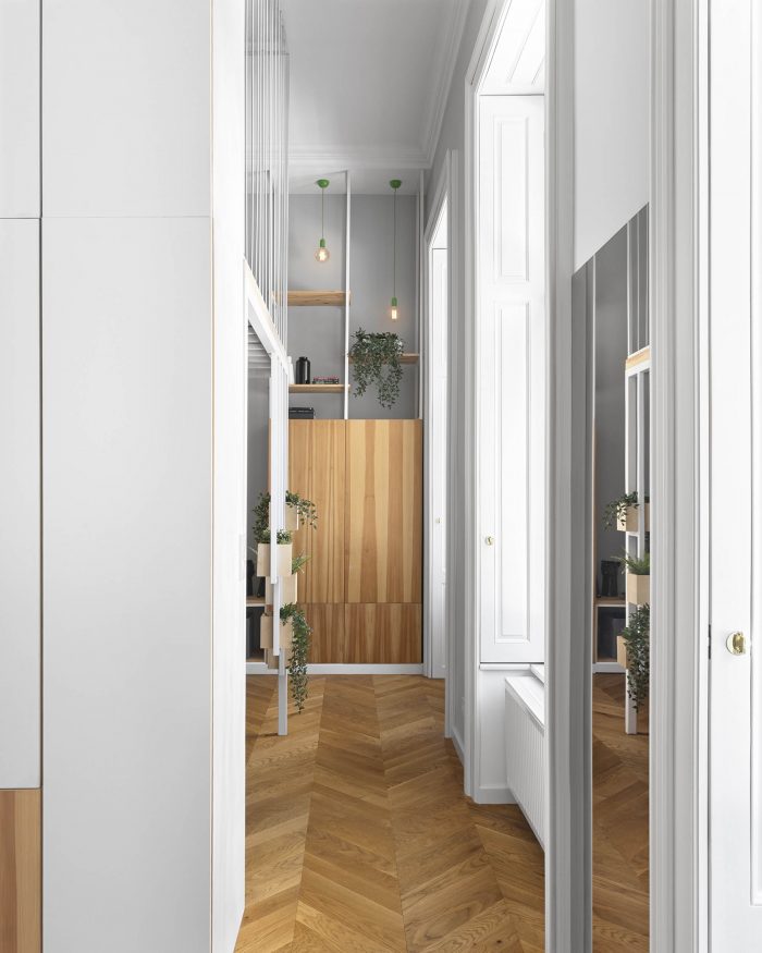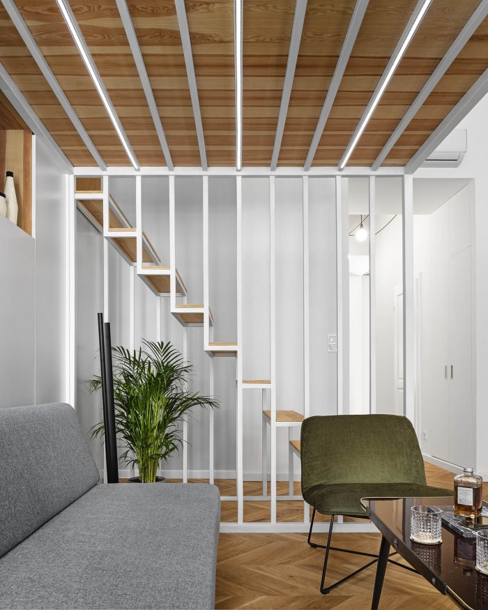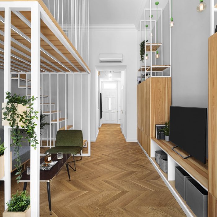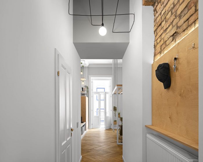 Situation. The aim of the project was the complete renovation and redesign of a bourgeois apartment located in the center of Budapest. During the design process, a light and fresh design was planned from a narrow and dark labyrinth-like property with the aim to be used as a short and long term rental apartment. This duality required adaptable and multi-functional spaces for 2+2 person occupancy.