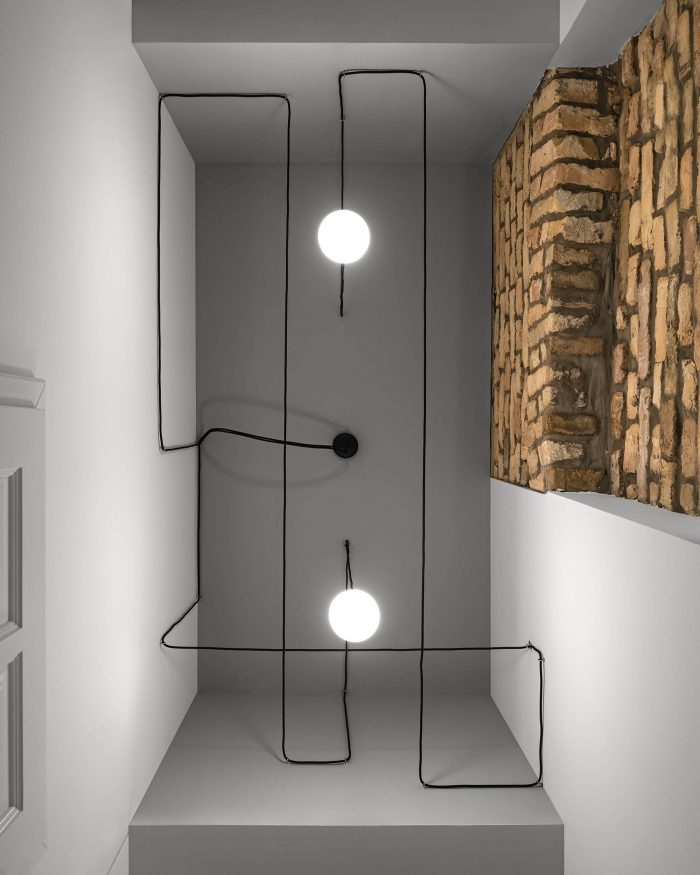 Details. An important concept was the constant use of natural wood material in all spaces. Because of this, the spaces are connected not only by the use of colors but also by the material. The color scheme (wood, white, gray) reflects simplicity and clarity that is complemented by some natural brick surfaces. The powerful green motifs in the bathroom appear softly in the other rooms, linking the relatively disconnected design of this space with the other rooms. Architectural approach and conceptual coherence played an important role in the styling of the apartment where we chose art by local contemporary artists such as ceramics by Petra Hidvegi and paintings by Gabor Koncz and Kata Bereczki of Lavor Collective. We selected all the accessories according to this philosophy, so that these objects could complete the design in a broader context.