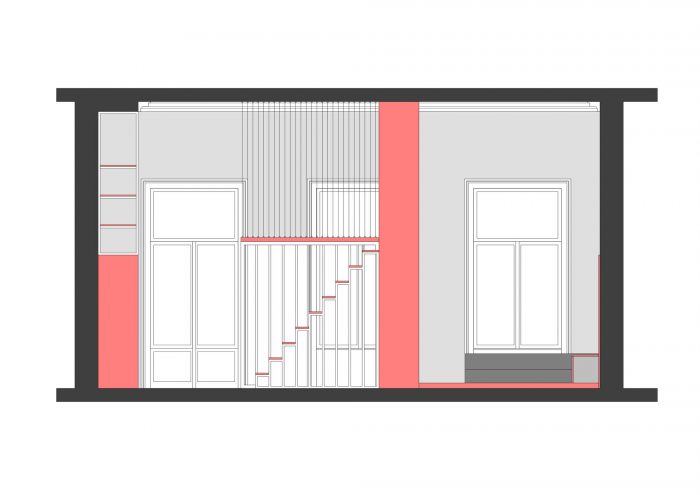 The service functions take place on the opposite side of the living area, next to the building's courtyard. It is separated by an enclosed toilet block and a corridor from the large living space on the street side. As a result, the apartment can take advantage of natural sunlight on both sides.
