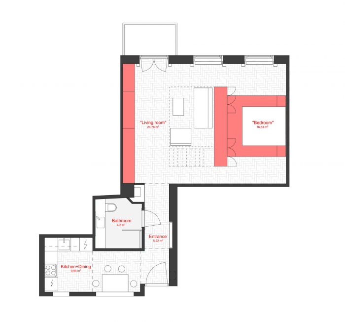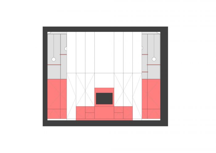 Concept. Instead of the current dark, enclosed and cramped spaces, a single 40 square meter common space was opened up creating a generous and adaptable functional system. The need for the gallery was important, but instead of having a confined cave-like element, it was placed in the middle of the space as a dais. At the same time, it has the opacity to let in natural light, has the lightness to let the surrounding functions function properly, and also serves as a separating piece between functions. This space-within-a-space system simultaneously provides an elevated private place in the gallery, a living room below and a semi-private part behind. It does not weigh down its functions with its massiveness and allows the user to wander around it while allowing the spaces and functions to flow into each other. This system provides the basics of functions that vary freely around it.