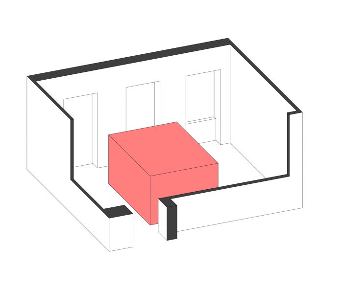 概念。取代目前黑暗、封闭和拥挤的空间,一个40平方米的公共空间被打开,创造了一个慷慨和适应性强的功能系统。画廊的需求是很重要的,但它不是有一个封闭的洞穴般的元素,而是被放置在空间的中间作为一个台子。同时,它具有不透明性,可以让自然光进入,具有轻盈性,可以让周围的功能正常运作,还可以作为功能之间的分隔件。这种空间中的空间系统同时在画廊中提供了一个高高在上的私人场所,下面是一个客厅,后面是一个半私人的部分。它不会因其庞大的体积而拖累其功能,并允许用户在其周围徘徊,同时允许空间和功能相互流动。这个系统提供了围绕它自由变化的功能的基本知识。