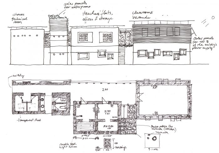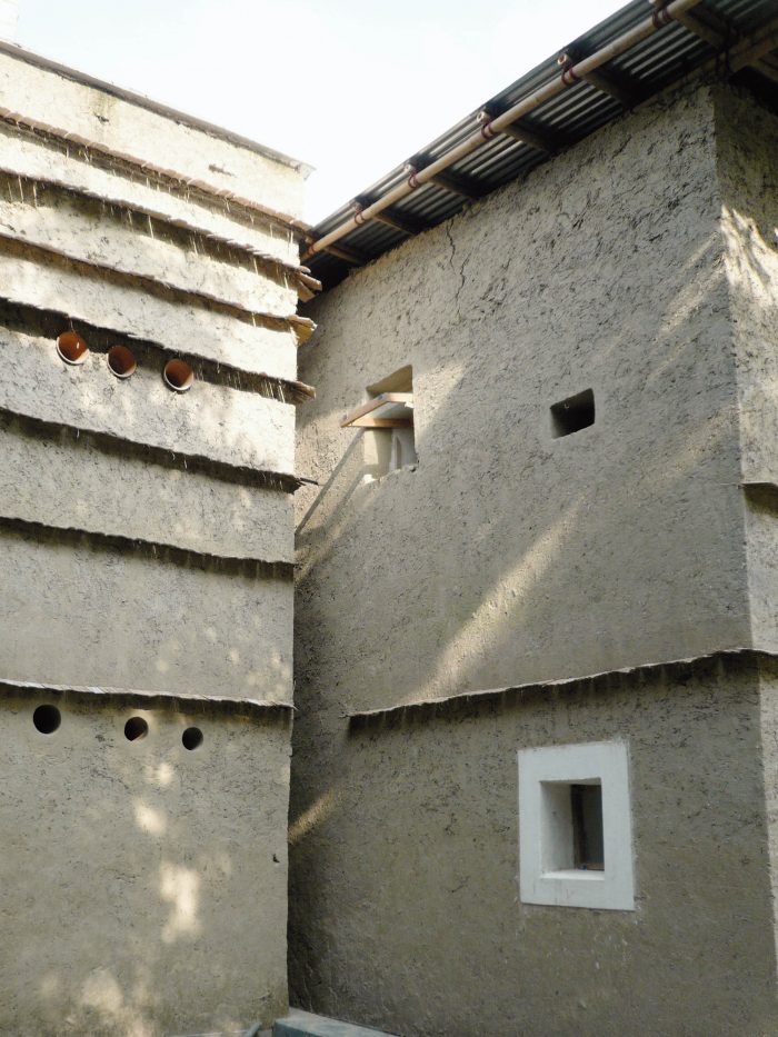 Solar panels produce 100% of the building’s energy needs. A solar thermal heating system provides warm water. Solar panels also directly power a motor which pumps water from a well into the water tank. The toilets have their own two chamber septic tank. This is the first time that sanitary units have been built into earth houses in Bangladesh, proving that mud and bamboo are flexible enough to accommodate modern lifestyle requirements.