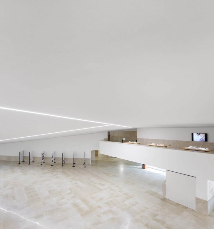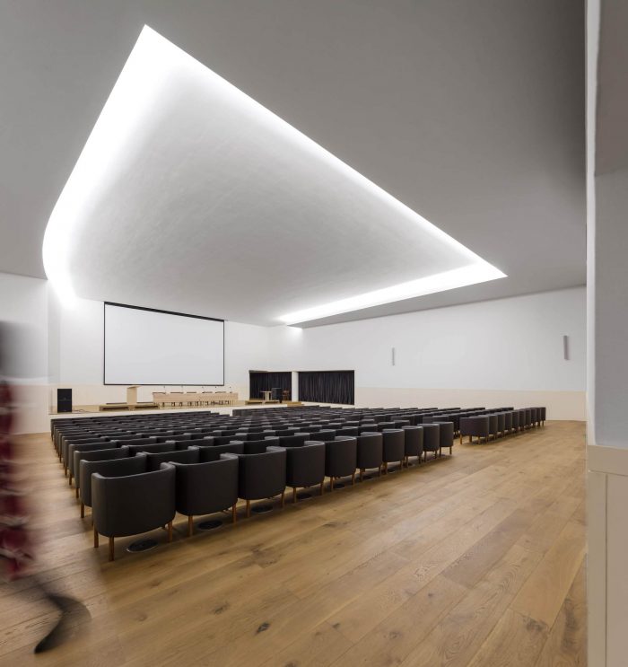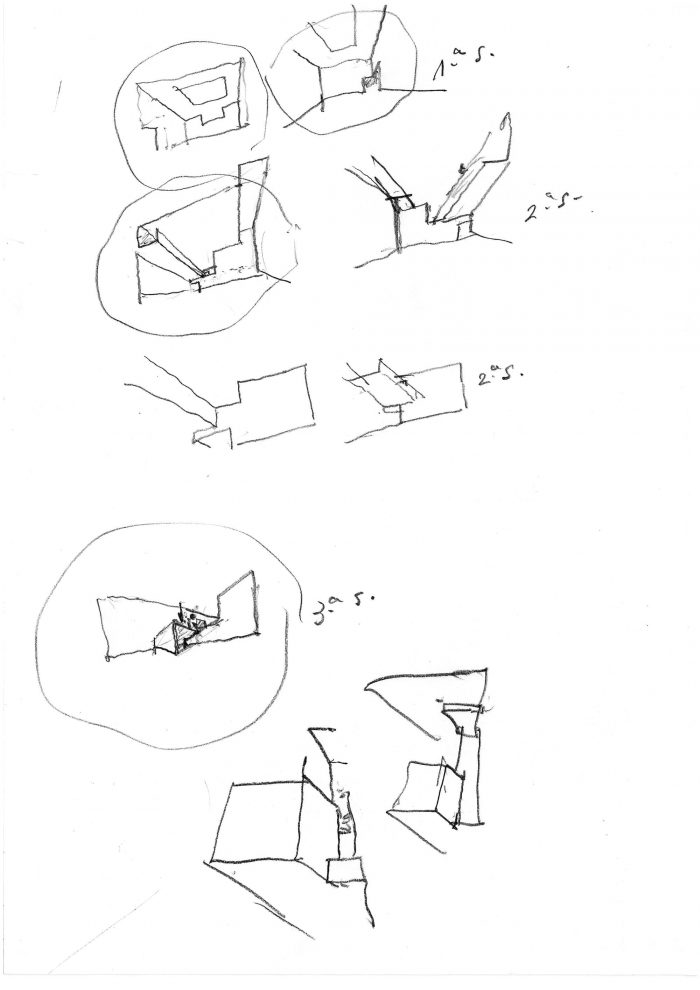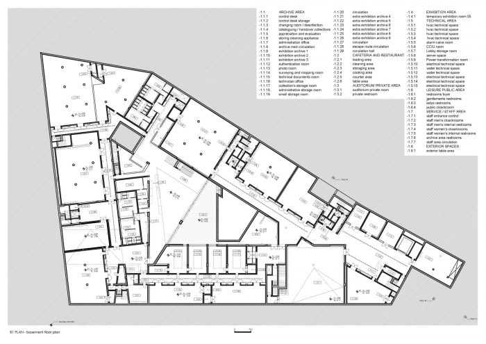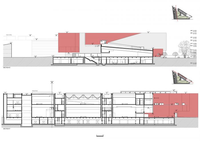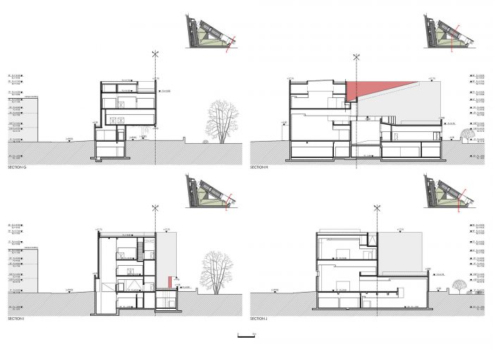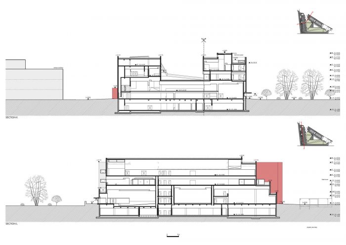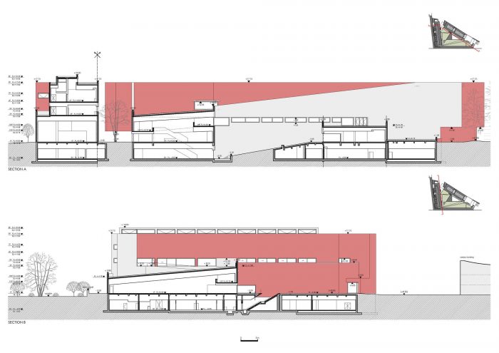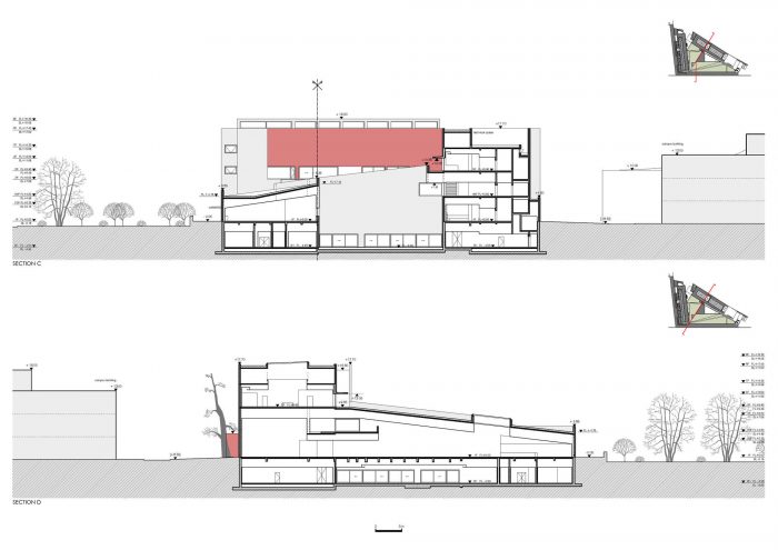 内部布局力求促进游客的顺利流动和空间的灵活使用。作为一个艺术学院,它的主要目的将是展示学生和教师的不同活动、语言和技术的成果,以及接待客人。地下室计划容纳技术区、档案室、服务区和一个咖啡馆,直接连接到建筑中心的一个三角形庭院。在它上面,底层包括入口、公共和休息区、分配、临时展厅和礼堂。一个夹层允许流通,并有一个斜坡连接到朝东的体量上方的屋顶花园。