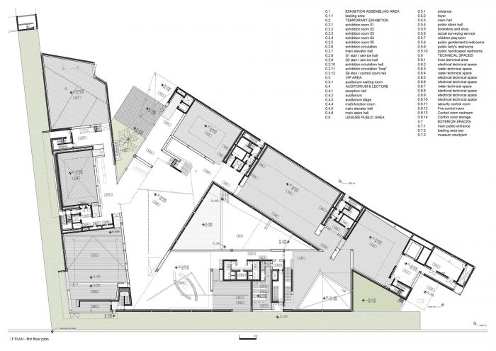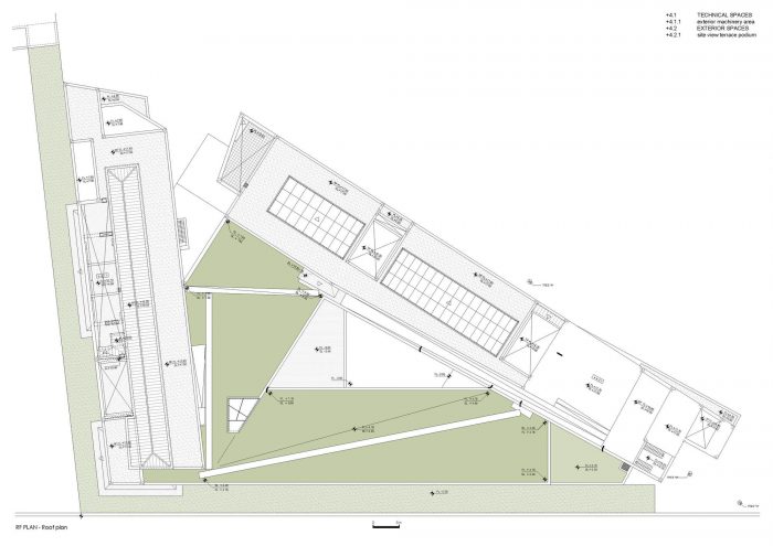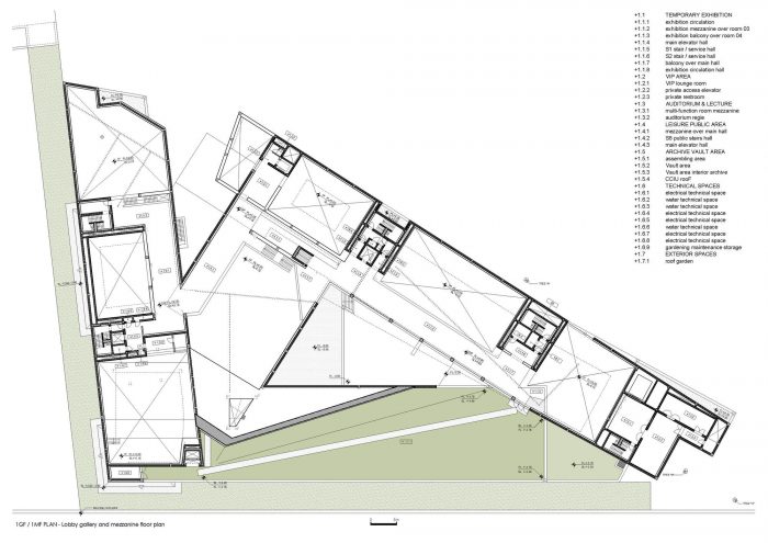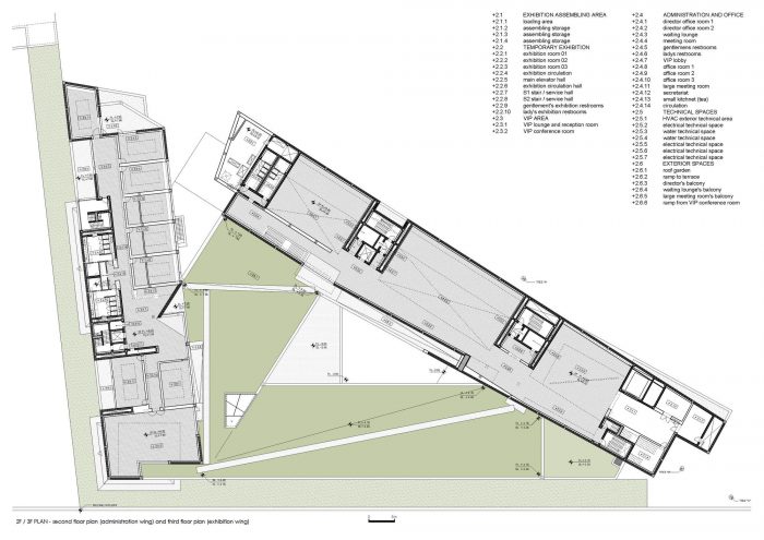 The internal layout seeks to facilitate smooth visitor flow and flexibility in the use of spaces. Being an art academy, its main purpose will be to display the results of different activities, languages, and techniques deployed by students and teachers, as well as to receive guests. The basement is planned to house the technical areas, archives, service areas, and a café connected directly to a triangular courtyard in the center f the building. Above it, the ground floor contains the entrance, public and rest areas, distributions, temporary exhibition halls, and auditoriums. A mezzanine level permits circulation and a ramp link to the roof garden above the east-facing volume.