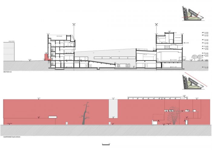 这个体量的顶层是包豪斯收藏品的永久展览。行政区域、年轻艺术家的工作室和一些基础设施都在朝南的高层。来自印度的红色阿格拉砂岩将定义体量和外部包层。一些平面,特别是在三角形的体量内,将用白色大理石包覆。框架将是铝/木制的。 一个白色混凝土的独立体量,垂直于南部边界插入,将被用作公众的入口。施工将很快开始。