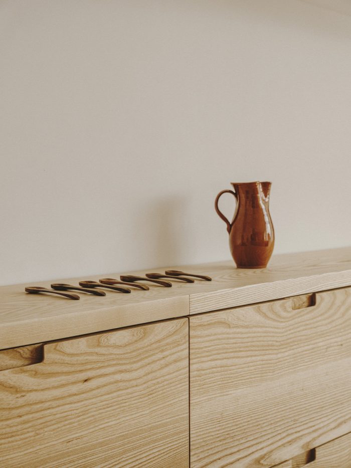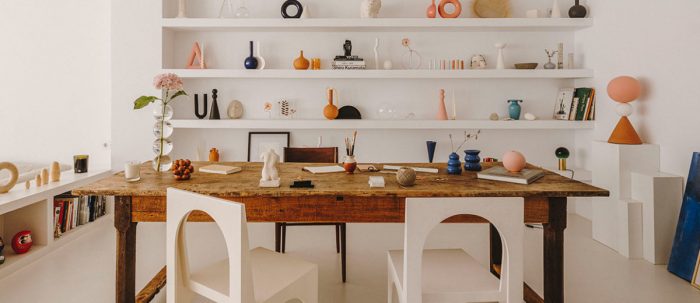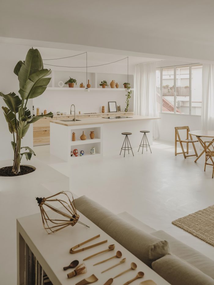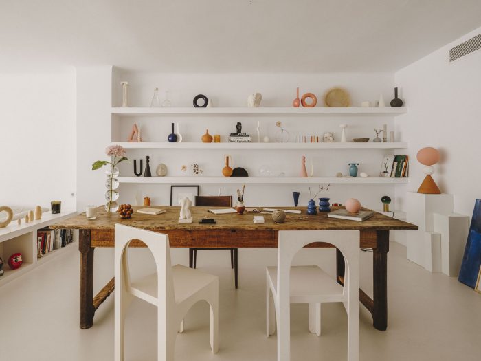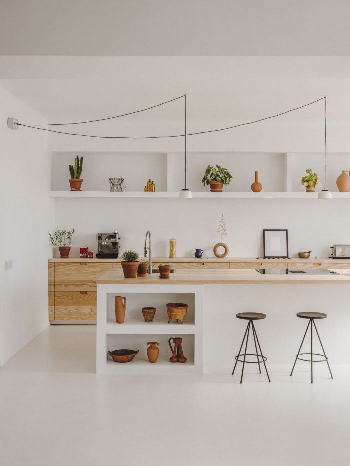 When two creative minds decide to transform their own home, the result can only be one of a kind. The Barcelona apartment of interior designer Isern Serra and ceramist Valeria Vasi proves it. Nestled on the fifth floor of a building built in the 1950s, the space was initially in a state of disrepair. The natural light, however, made the couple fall in love with it immediately. In only four months, Serra and Vasi transformed the 120 square metres of what was an old office into a minimalist yet warm home-studio. Starting from scratch, they removed walls and reorganized everything in the L-shaped apartment.