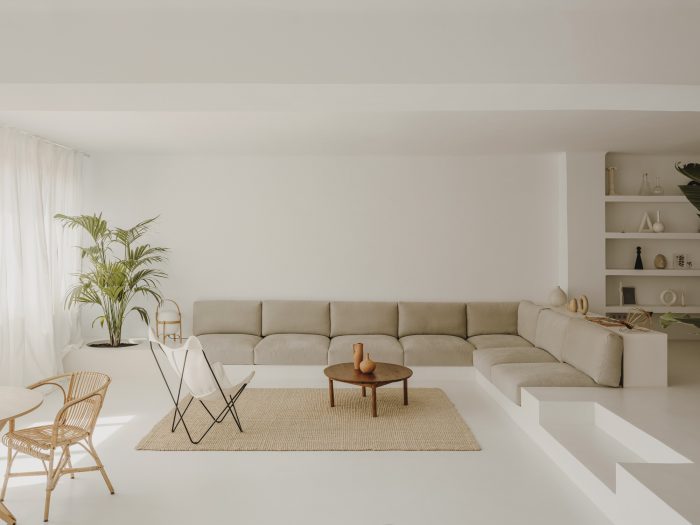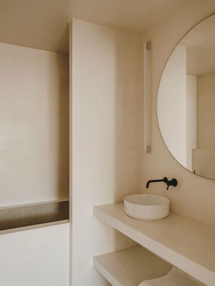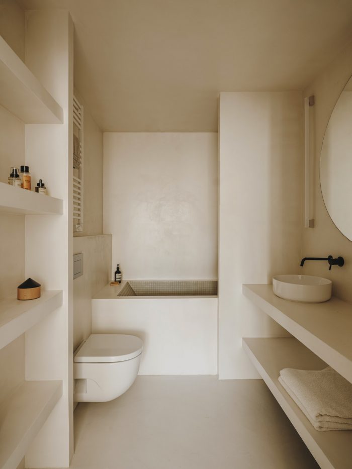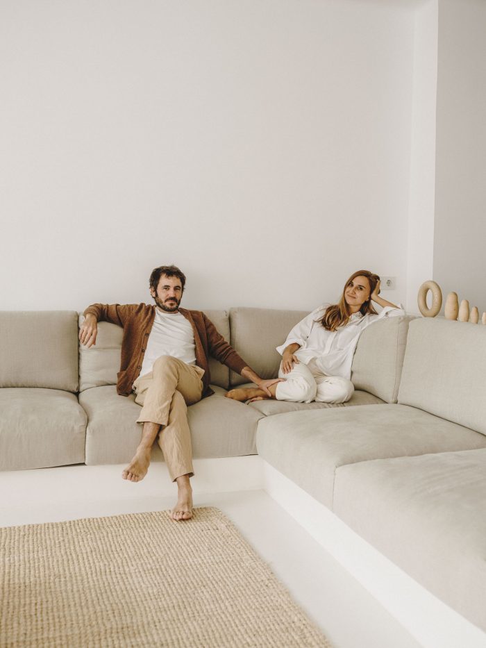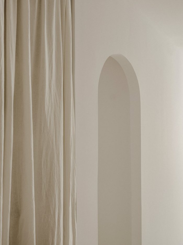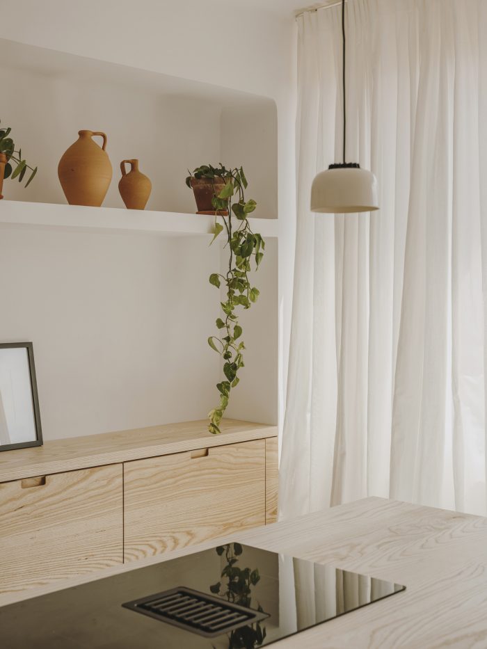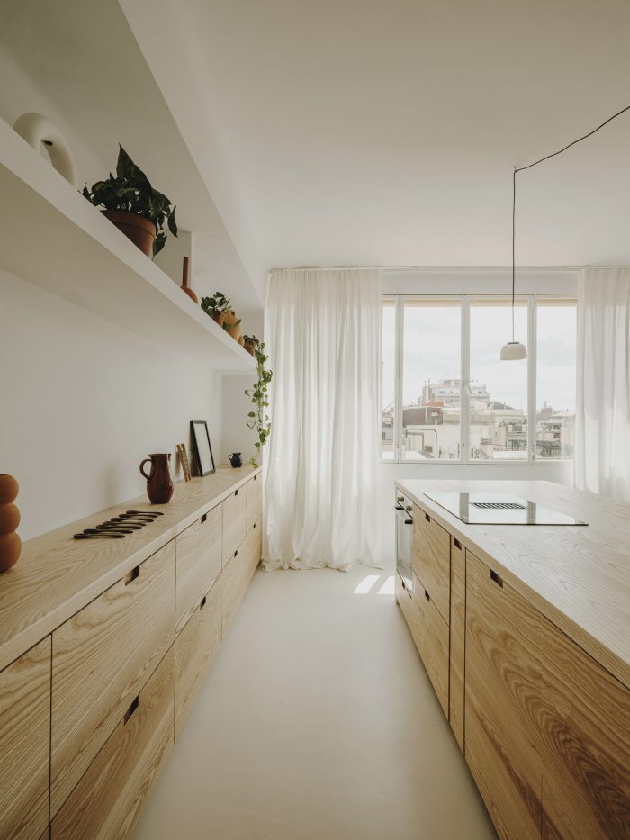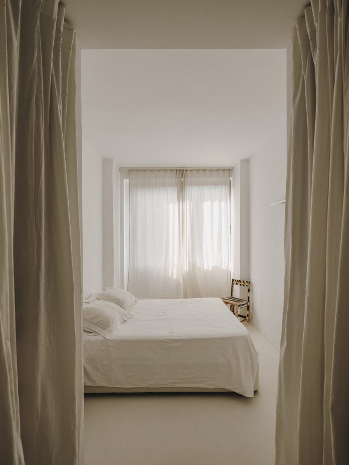“We wanted something very neutral and warm at the same time,” the couple confesses. Inspired by Spanish craftsmanship, Mediterranean influences and the work of architect Josep Antoni Coderch (1913-1984) — especially his way of revaluing vernacular architecture — Serra and Vasi imagined the project to give the feeling of a covered terrace with a clean and bright aesthetic. One step leads to a transitional space, which has become Vasi’s creative area, furnished with a table from the 19th century. With its two bedrooms, the night area is not separated from the rest by doors or walls. Instead, linen curtains help to connect everything together in a seamless way. As an ode to simplicity, the master bedroom comprises the bare minimum with its bed, chair by Marc Morro and two side tables. Airy and uncluttered yet creative and inspiring, this apartment focuses on what’s truly essential for its inhabitants.