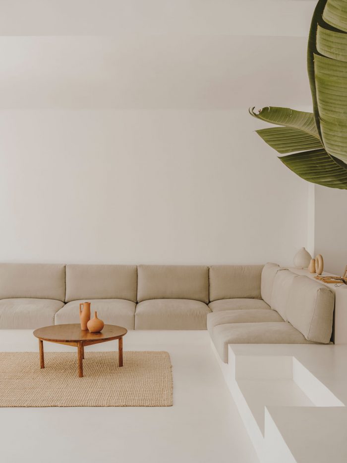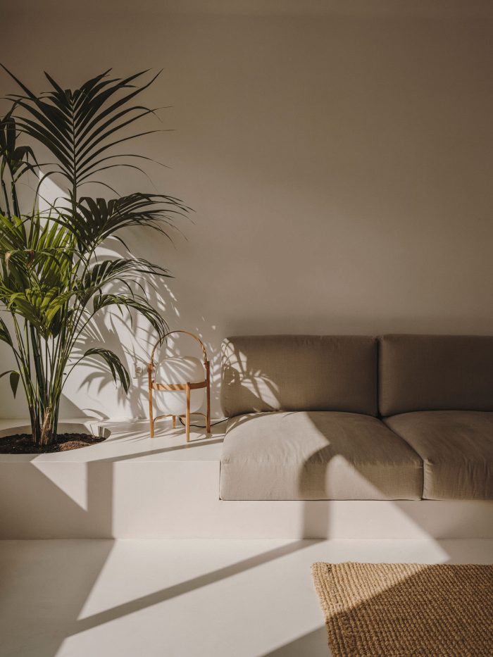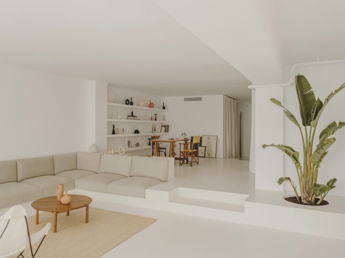 Facing the interior patio and positioned well for the morning light, the kitchen/dining/living area is particularly quiet. “We always liked the idea of having breakfast in the sun,” says the duo, who wanted to create a very open and social space. Behind the large central island, a shelf showcases many objects the couple has found during their travels around the world. A TMM floor lamp by Miguel Milà and a Subeybaja table by Robert Heritage and Roger Webb — both for Santa & Cole — Nuta stools by Lluís Pau for Mobles 114, and Salvador chairs by Miguel Milà from AOO are some of the pieces the couple chose to furnish the space. In the double-height living room, Serra designed the built-in sofa. The white walls and microcement flooring shape the peaceful atmosphere where plants, ceramic pieces by Vasi and the first paintings from her mother (Russian artist Inna Vasilieva) bring touches of colour.