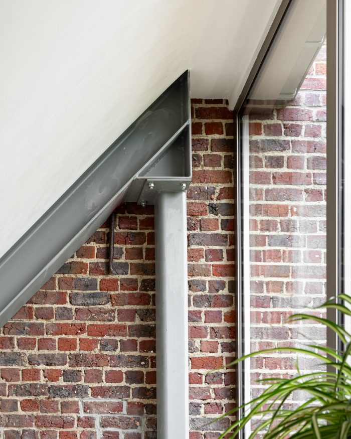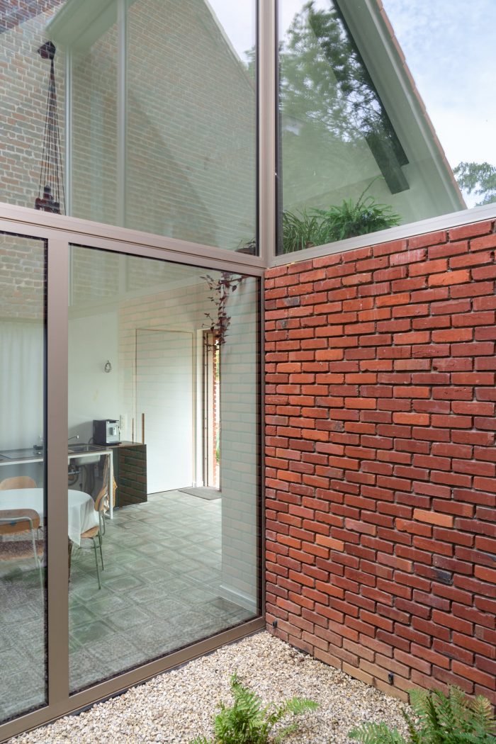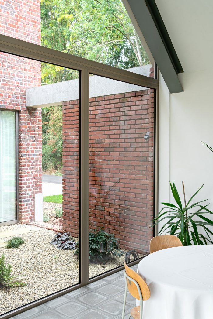 The entrance to the house was moved to the barn. Through a patio right next to the original house, residents and visitors enter a beautiful open entrance hall that connects to the storage room, living room, and kitchen. The exposed high ceilings in the barn - of which the roof was completely renewed - provide a spacious feeling. The large windows in turn ensure an abundance of daylight. Old and new go hand in hand. The plastered walls of the newly installed volumes and the steel supporting structure contrast beautifully with the original brick wall. The champagne-colored exterior joinery provides soft lines and, depending on the incidence of light, a warm glow.