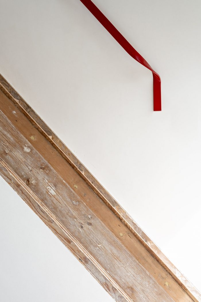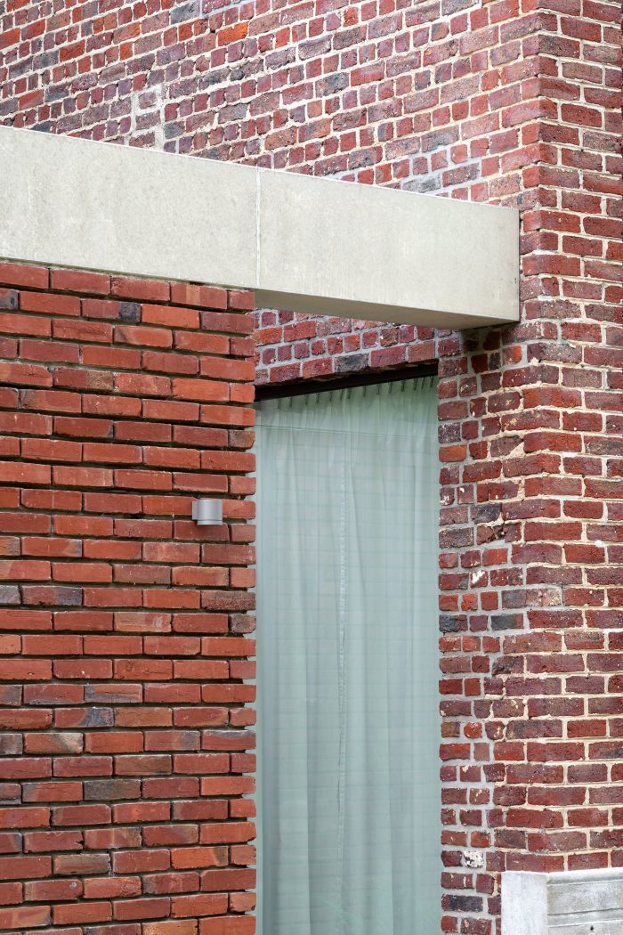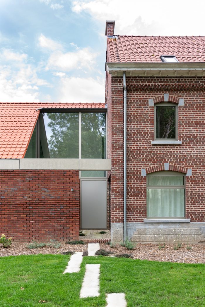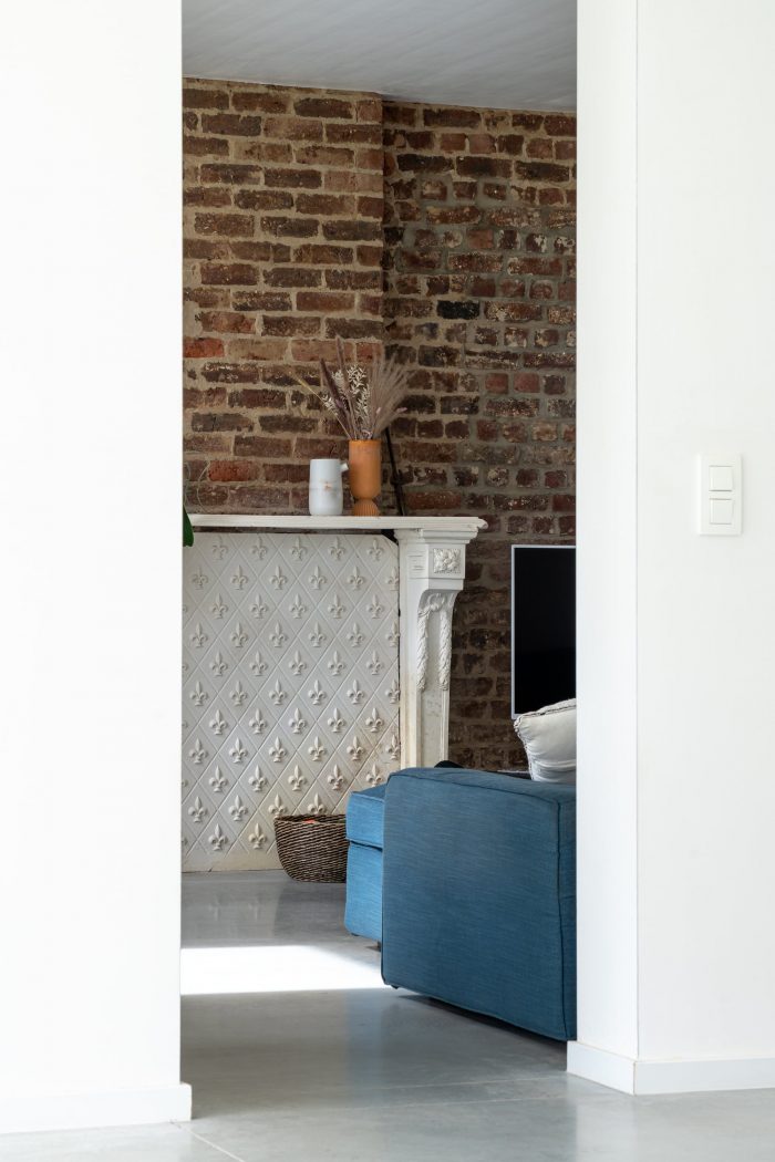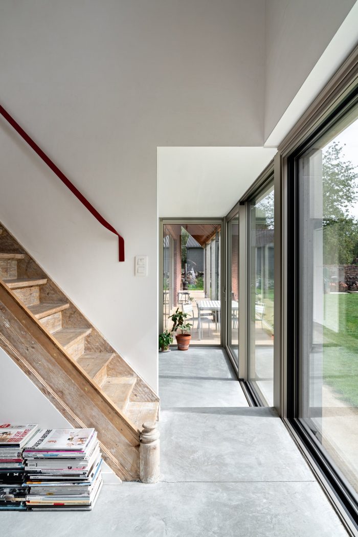 In the original house, authentic elements and contemporary features alternate. The wooden staircase, for example, was given a facelift and was complemented with a deep red, twisted steel handrail. The original door to the cellar and a charming little cupboard was retained. Together with the old fireplace mantel, they remind us of the rich history of the house. The walls of the former bedroom, accessible via a step, have partially disappeared. As a result, the differences in level on the ground floor give the whole a playful character and, together with the preserved walls, they separate the different zones in the otherwise rather open space.
