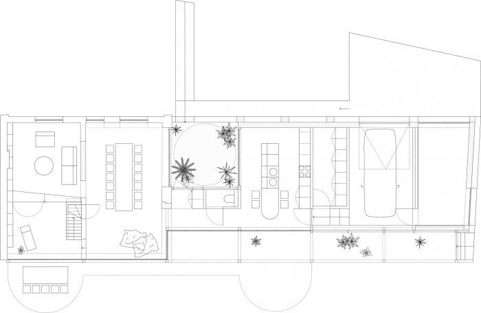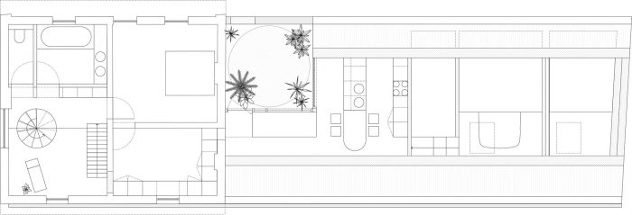 在原来的房子里,真实的元素和现代特征交替出现。例如,木制楼梯被改头换面,并辅以深红色的扭曲的钢制扶手。通往地窖的原始门和一个迷人的小柜子被保留下来。它们与旧的壁炉壁架一起,提醒我们这所房子的丰富历史。以前的卧室的墙壁,可以通过一个台阶进入,已经部分消失了。因此,一楼的水平差异给整个空间带来了有趣的特点,与保留下来的墙壁一起,它们在原本相当开放的空间里分隔出不同的区域。