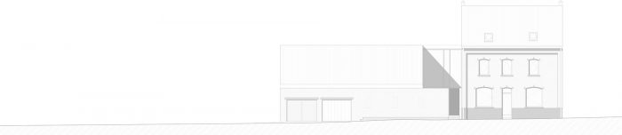 Urban planning regulations forced us to rebuild the barn. Therefore, this ruin was renovated and partly incorporated into the living area. Another part was converted into a double garage. The original front façade of the house was restored to its former glory, and the view of the barn was not changed either, again because of the local planning regulations. The rear façade, however, was fitted with large windows that offer a magnificent view of the surrounding fields and nature. They also connect the two volumes in one movement by means of a prominent concrete portico structure that also gives shape to the roof gutter and the crown molding.
