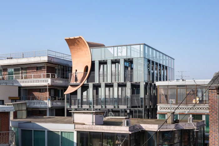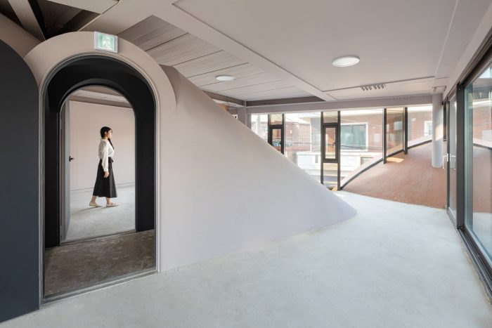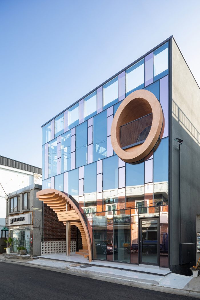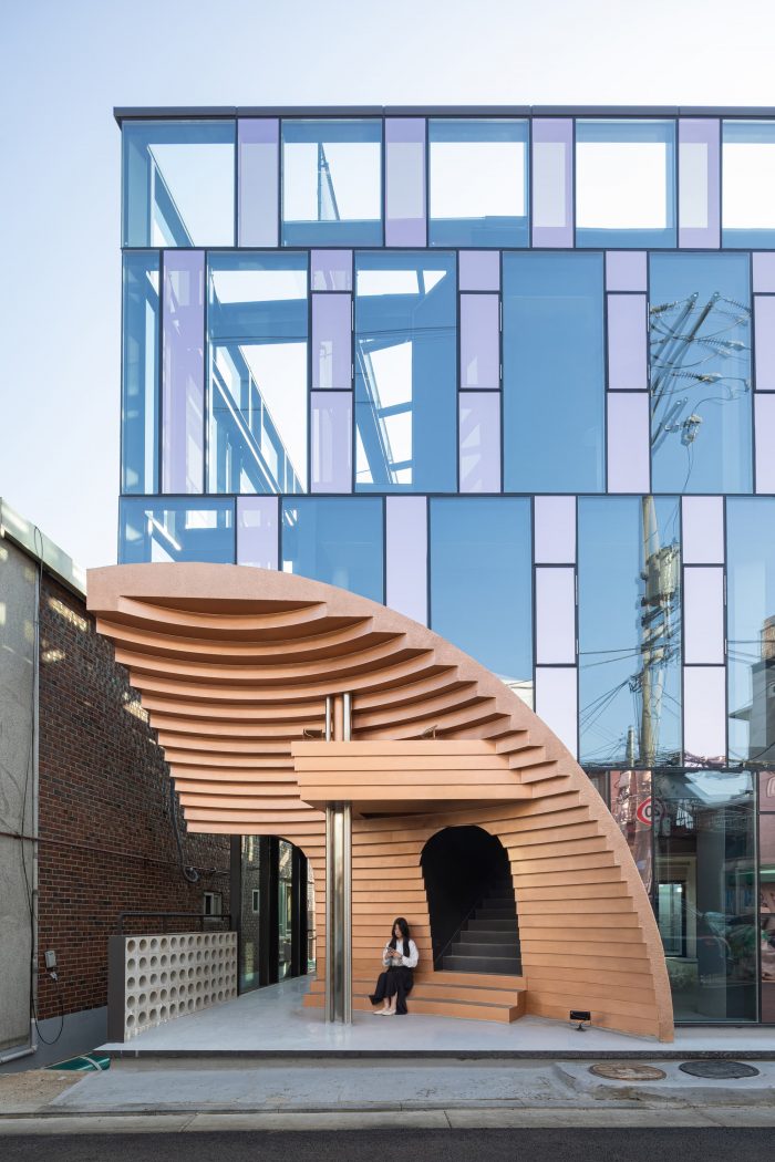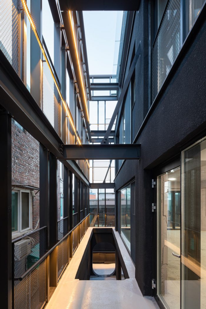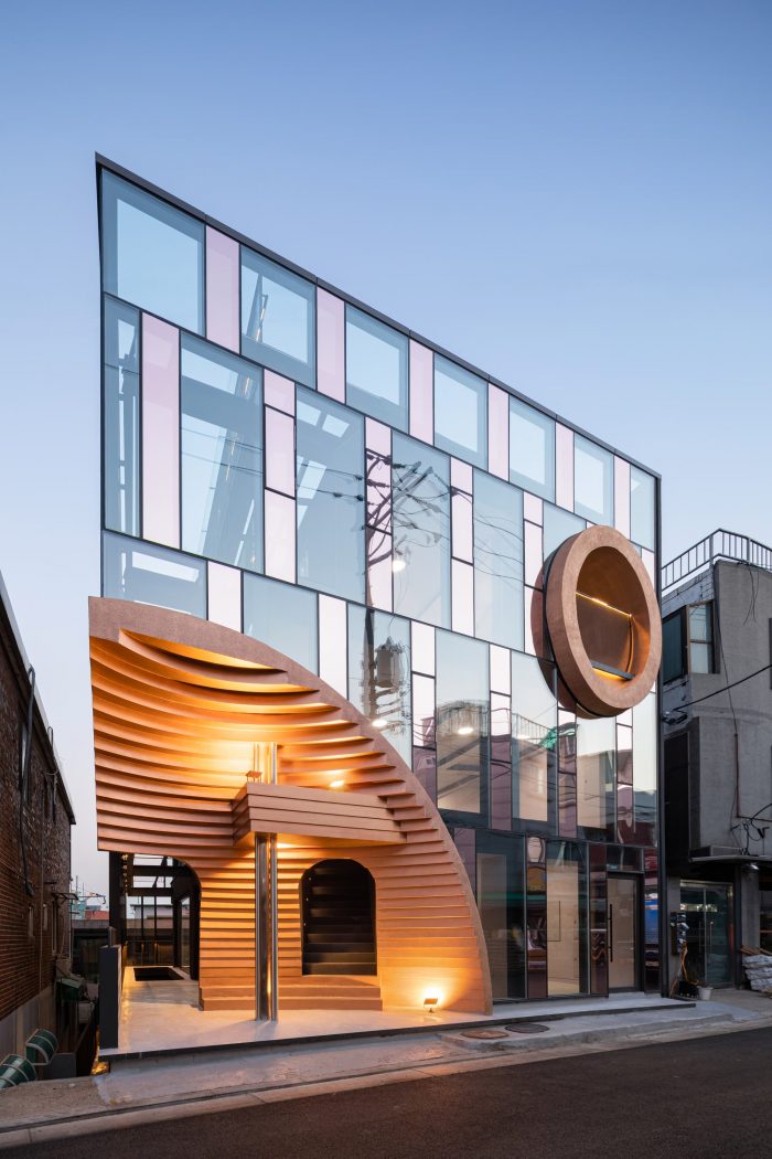 The existing building was built in the 1980s with bricks and concrete and was designed as a small residence. The basement residence conditions were harsh and even the above-ground residences had just the basics, having none of the great views taken into account for the quality of the house. I think that was the case in the 80s in Seoul, where most houses were built hastily without any consideration for quality of life. So Most of the existing walls are removed, but most concrete structures are kept. The commercial (rent space) nature of the development drove with curtain walls with minimum walls within the floors. The diagonal staircase roughly halves 1,2 on the 3rd floor but allows circulation around most of it (except the 3rd floor). The stair becomes something like a giant animal rising through the floors, bringing something special to the homogeneous space. It could behave as a dual, one as a piece to attach creative furniture of partitions, the other as a bothering hindering mass in the middle.