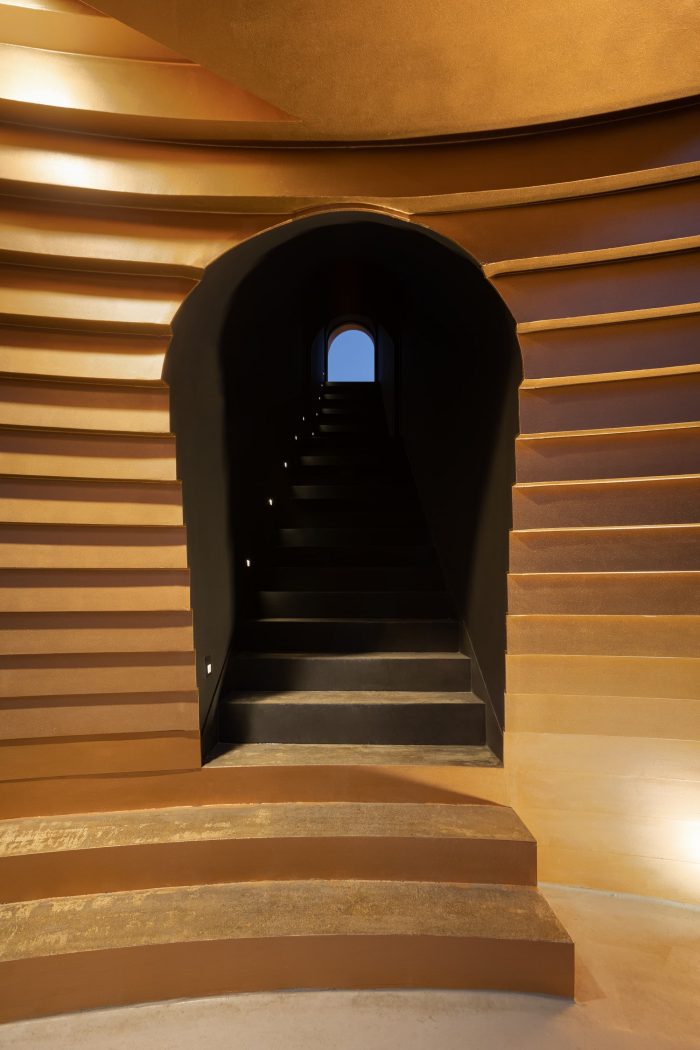 The first idea is to provide a rooftop view that is blocked by the building itself. A wormhole-like, diagonal, floor-piercing staircase starts from the roadside leading to the balcony on the 2nd floor providing a great view. This diagonal blackhole wormhole staircase is designed as an offering, an offering to the public, like the offering of a shaded arch by Louis Khan at Kimbell. Another public offering is a circular seat disguised as steps at the entrance concave. I designed these offerings with the intention of inviting many passer-byes to experience the view of the street, and the rooftop view.