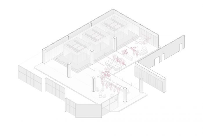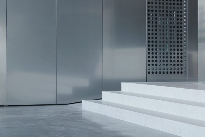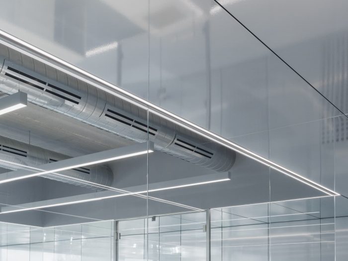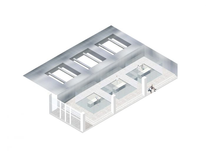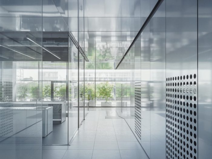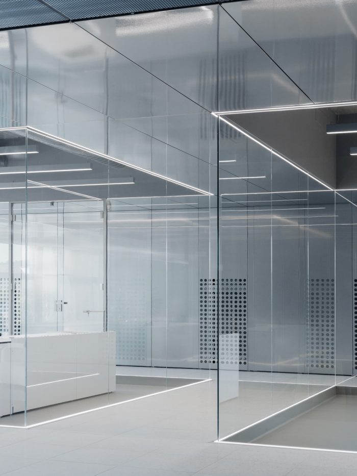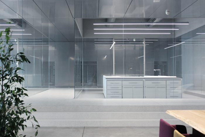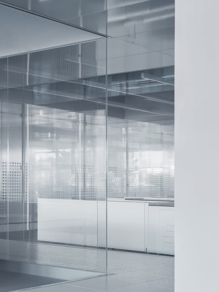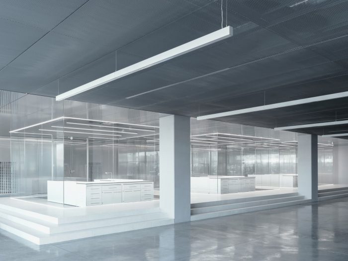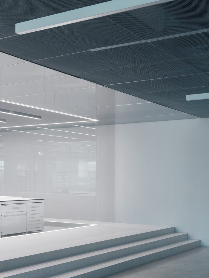 The centerpiece of the project is the new glazed laboratories, which consist of three crystal volumes placed on a solid podium that lifts them up both physically and symbolically - transforming a space that is usually hidden into the new heart of the environment. A reflective aluminum surface acts as a background, illuminating the space and creating elegant and discreet scenography. The L-shaped space in front of the laboratories is furnished with colorful furniture to create a flexible, informal working environment that promotes creativity, knowledge, and interaction. The materials of the claddings change consistently, with reflective aluminum panels transforming into expanded metal sheets, introducing a perceptive nuance that combines the formal laboratory space with a more informal working environment. The elements are dimensioned and placed according to a modular grid that conveys order and precision, and the lighting elements follow the same grid.
