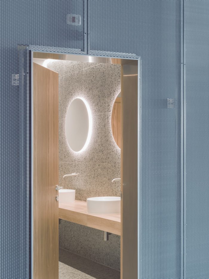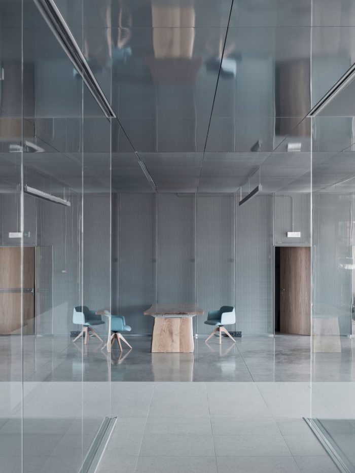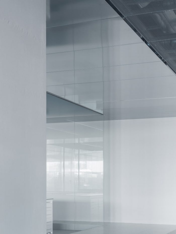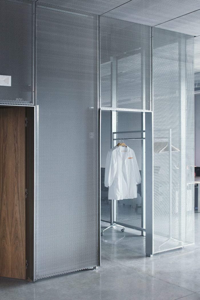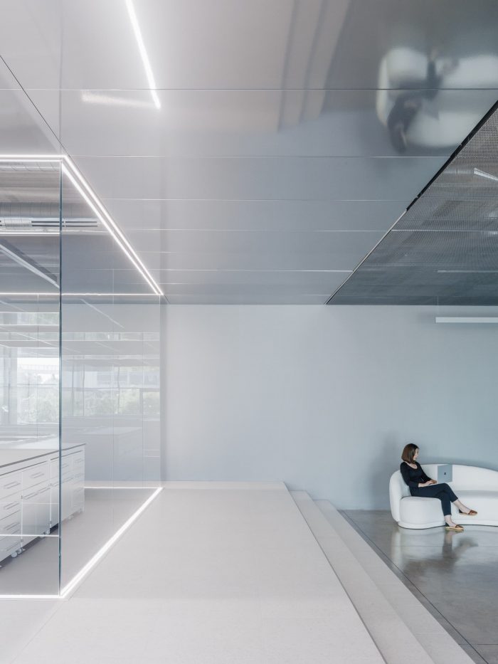 该项目的核心是新的玻璃实验室,它由三个水晶体组成,放置在一个坚实的平台上,从物理和象征意义上提升了它们--将一个通常隐藏的空间转变为环境的新核心。反光的铝制表面作为背景,照亮了空间,创造了优雅而谨慎的场景。实验室前面的L型空间摆放着彩色的家具,以创造一个灵活、非正式的工作环境,促进创造力、知识和互动。墙面的材料不断变化,反光的铝板变成了膨胀的金属板,引入了一种感知的细微差别,将正式的实验室空间与更非正式的工作环境相结合。这些元素的尺寸和摆放都是按照模块化网格进行的,传达了秩序和精确性,照明元素也遵循同样的网格。