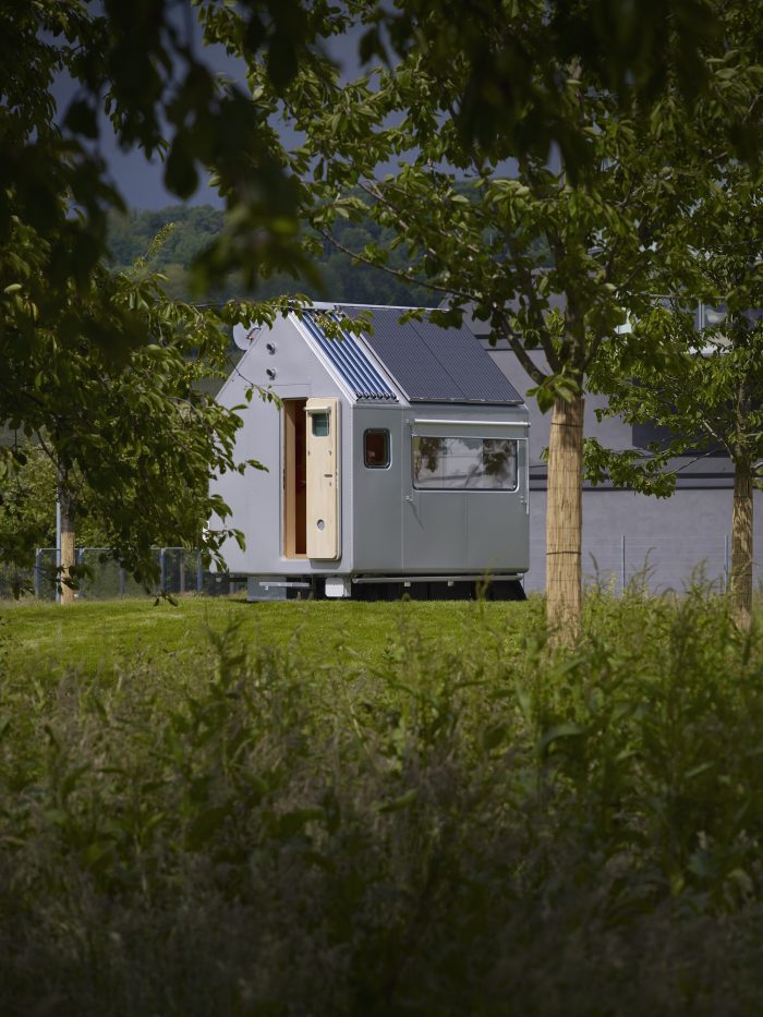 This current incarnation is the result of that collaboration. With its own water collection and energy systems, the design is entirely self-contained and contains everything needed to live a simple lifestyle, all in a space small enough to be delivered on a truck. Constructed in timber, the pitched roof indicates the function of the tiny space, however the aluminium cladding and rounded edges hint at the technology which underpins the design's self-sufficient nature.