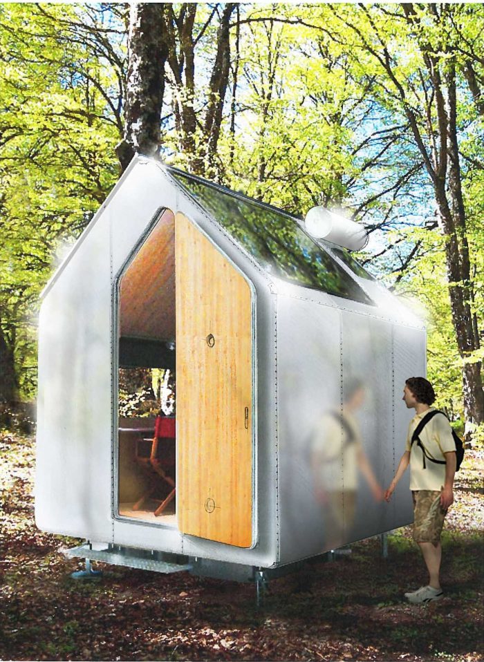 目前的化身就是这种合作的结果。该设计有自己的水收集和能源系统,完全自成一体,包含了简单生活方式所需的一切,所有这些都在一个小到可以用卡车运送的空间里。用木材建造的倾斜屋顶表明了这个小空间的功能,然而铝包层和圆形边缘暗示了支撑该设计自给自足性质的技术。