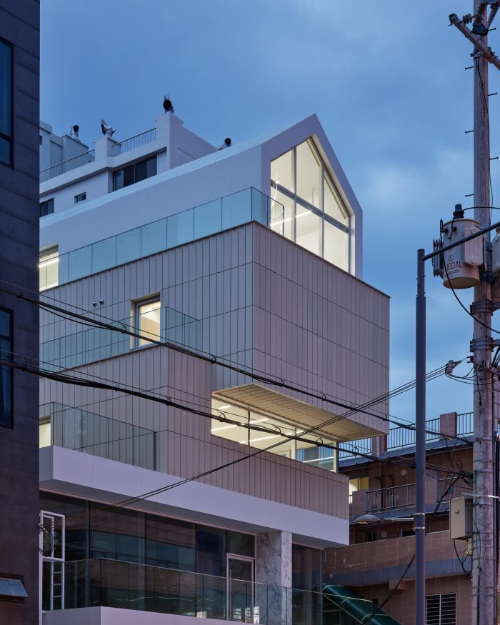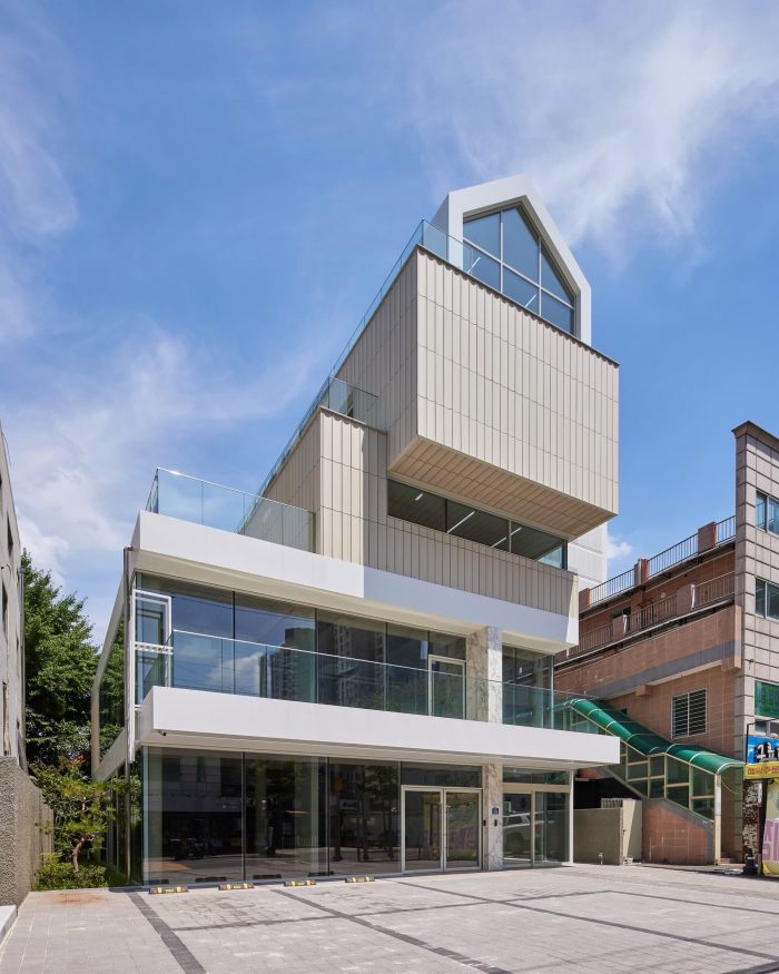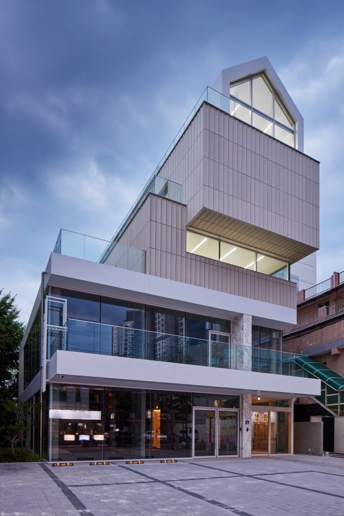 In the lower part, openness through full-height windows and an external terrace on 2nd level facing the main street is intended to create a lively atmosphere in continuity with the commercial street. A neighboring fence with tooled surface surrounds the ground floor to provide a cozy atmosphere. A vertical wall with Calacatta marble was independently placed on the lower level of the horizontal plate to secure a sense of proportion to the front facade and to divide the main entrances.