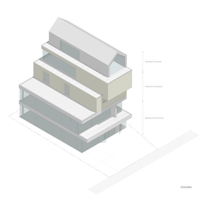 Indentation - The overall massing is indented in a direction toward the main street to avoid the stepped shape but to acquire a three-dimensional front facade. The commercial space of the lower floor expresses the linear horizontal plate for openness while the upper office space projects the solidity & identity of the company. The top floor with a pitched roof barrel form is topped with a great penetrating view. The volume formed according to the characteristics of each program was recognized as a stacked shape, rather than a cascading shape.