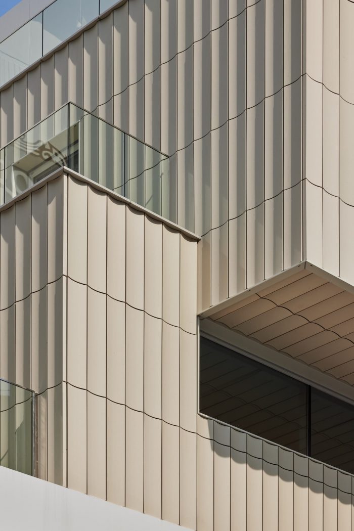 In the upper part used as a workspace, the openings were minimized to express a solidity for the front facade in contrast with the glassy lower part, and windows and doors were placed on the side linked to the external terrace. The outer shell of the solid volume is finely articulated through vertically arranged curved terracotta panels to create a texture, and the soft curved shadows reveal the richness of the surface.